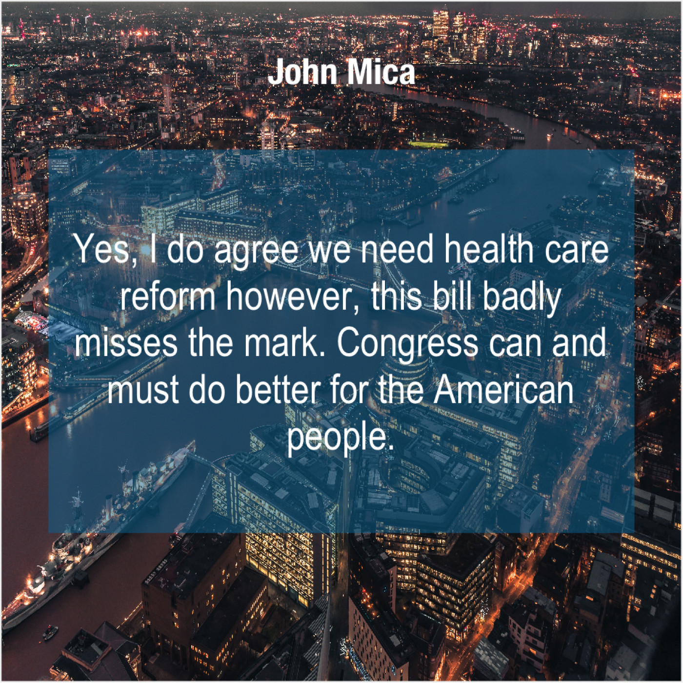 John Mica John Mica – Yes, I do agree we… March 15, 2019 admin “Yes, I do agree we need health care reform however, this bill badly misses the mark. Congress can and must do better for the American people.”-John Mica