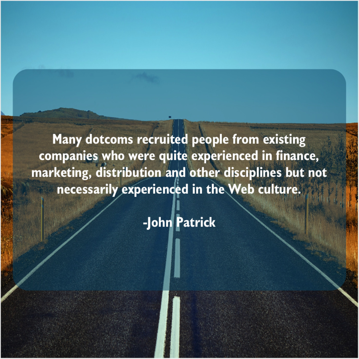 John Patrick John Patrick – Many dotcoms recruited people from… December 22, 2018 admin “Many dotcoms recruited people from existing companies who were quite experienced in finance, marketing, distribution and other disciplines but not necessarily experienced in the Web culture.”-John Patrick