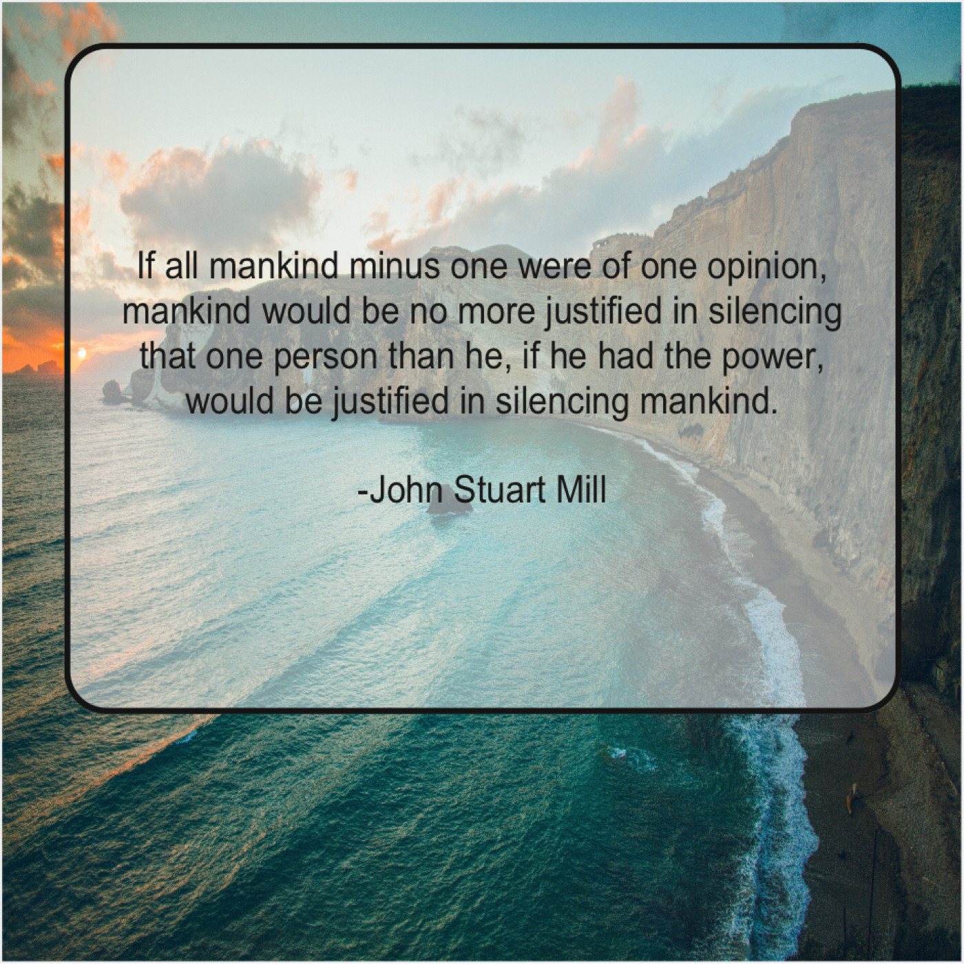 John Stuart Mill John Stuart Mill – If all mankind minus one… June 27, 2019 admin “If all mankind minus one were of one opinion, mankind would be no more justified in silencing that one person than he, if he had the power, would be justified in silencing mankind.”-John Stuart Mill