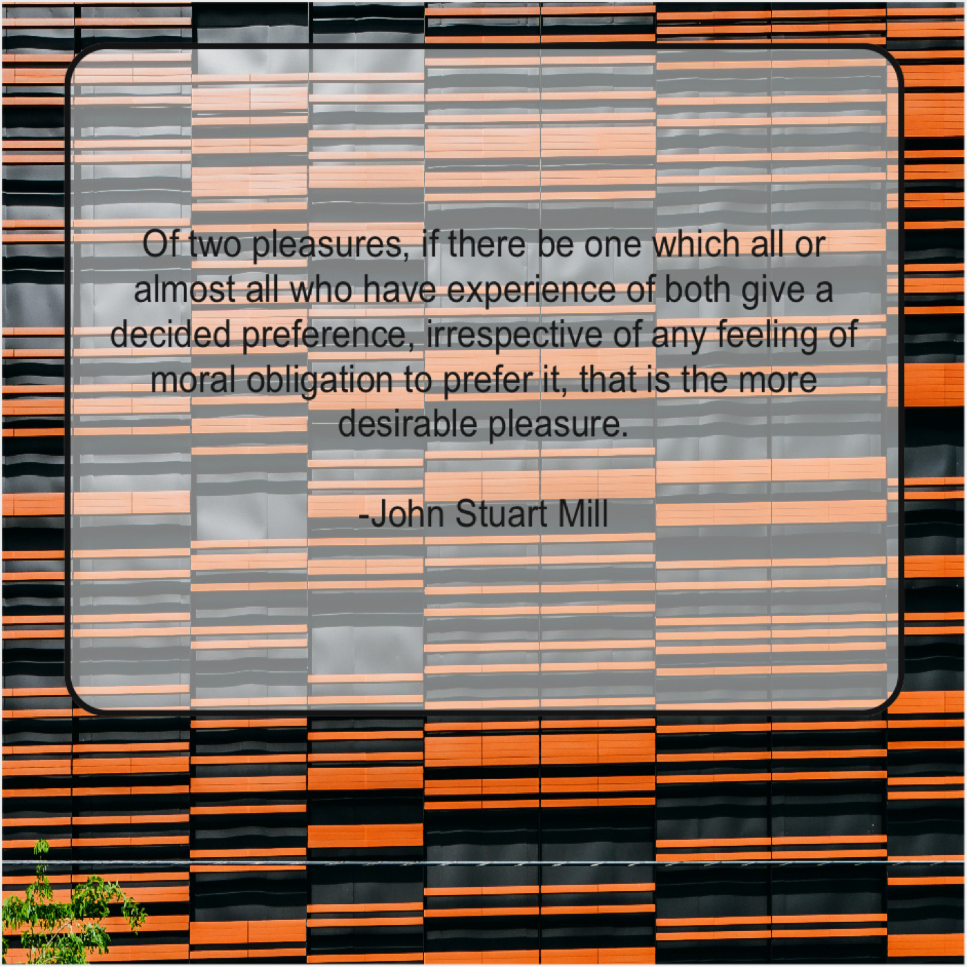 John Stuart Mill John Stuart Mill – Of two pleasures, if there… May 20, 2019 admin “Of two pleasures, if there be one which all or almost all who have experience of both give a decided preference, irrespective of any feeling of moral obligation to prefer it, that is the more desirable pleasure.”-John Stuart Mill