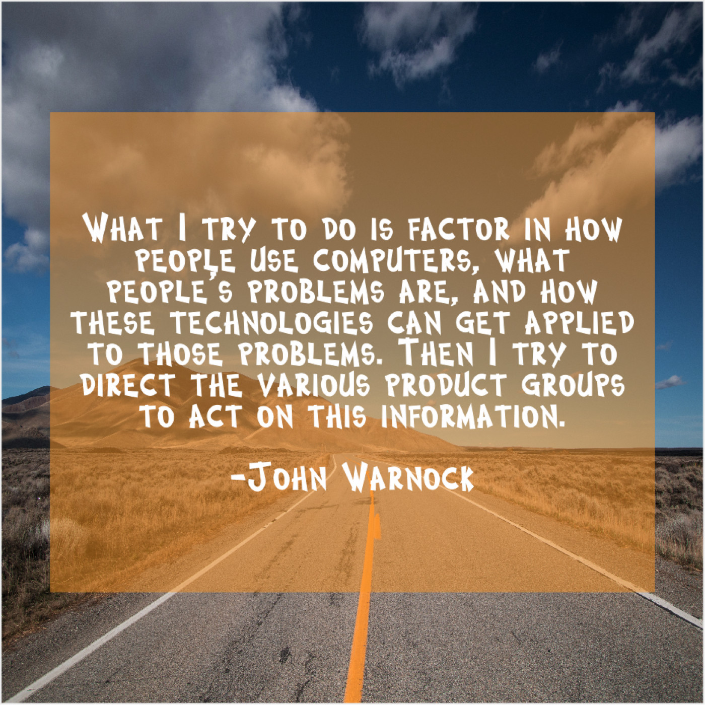 John Warnock John Warnock – What I try to do… October 15, 2019 admin “What I try to do is factor in how people use computers, what people’s problems are, and how these technologies can get applied to those problems. Then I try to direct the various product groups to act on this information.”-John Warnock