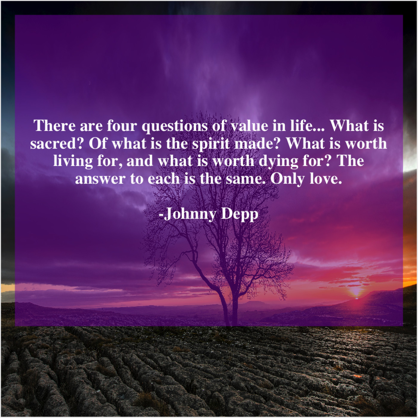 Johnny Depp Johnny Depp – There are four questions of… August 1, 2019 admin “There are four questions of value in life… What is sacred? Of what is the spirit made? What is worth living for, and what is worth dying for? The answer to each is the same. Only love.”-Johnny Depp