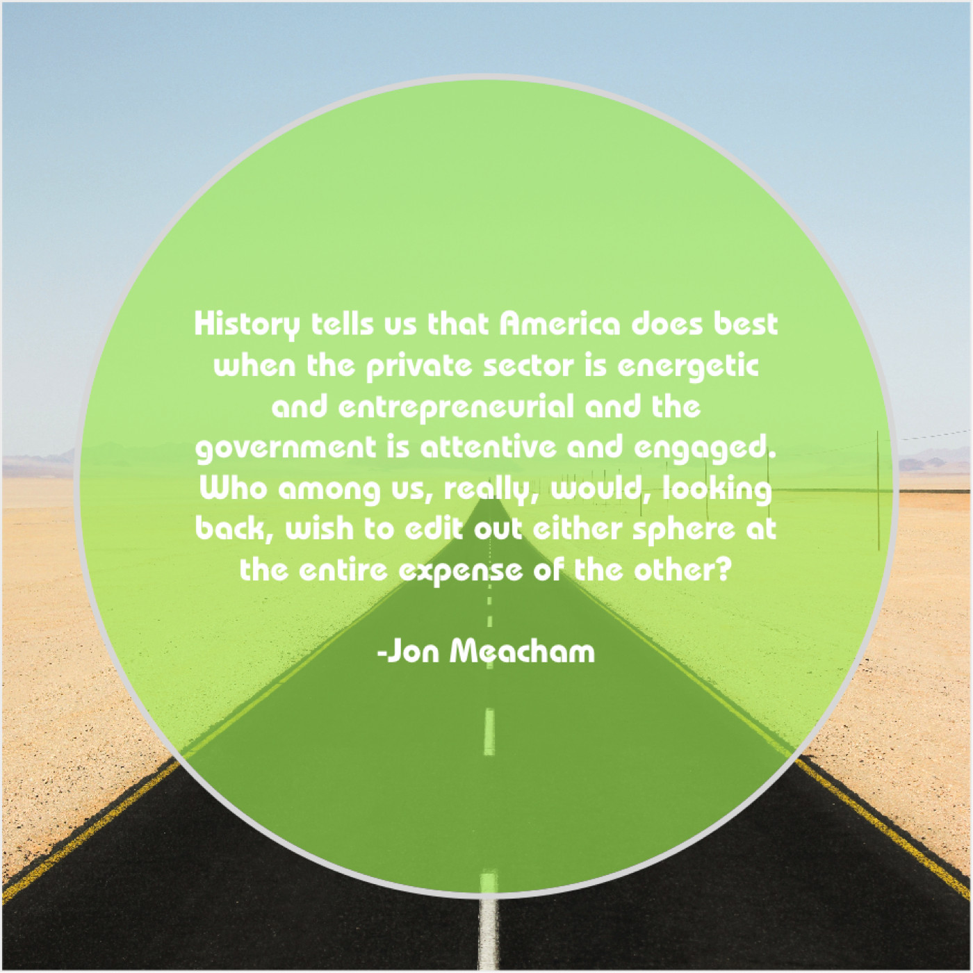 “History tells us that America does best when the private sector is energetic and entrepreneurial and the government is attentive and engaged. Who among us, really, would, looking back, wish to edit out either sphere at the entire expense of the other?”