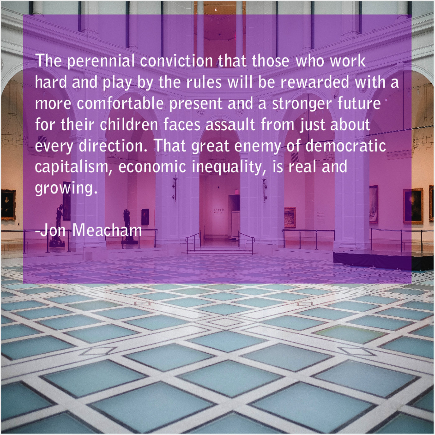 “The perennial conviction that those who work hard and play by the rules will be rewarded with a more comfortable present and a stronger future for their children faces assault from just about every direction. That great enemy of democratic capitalism, economic inequality, is real and growing.”