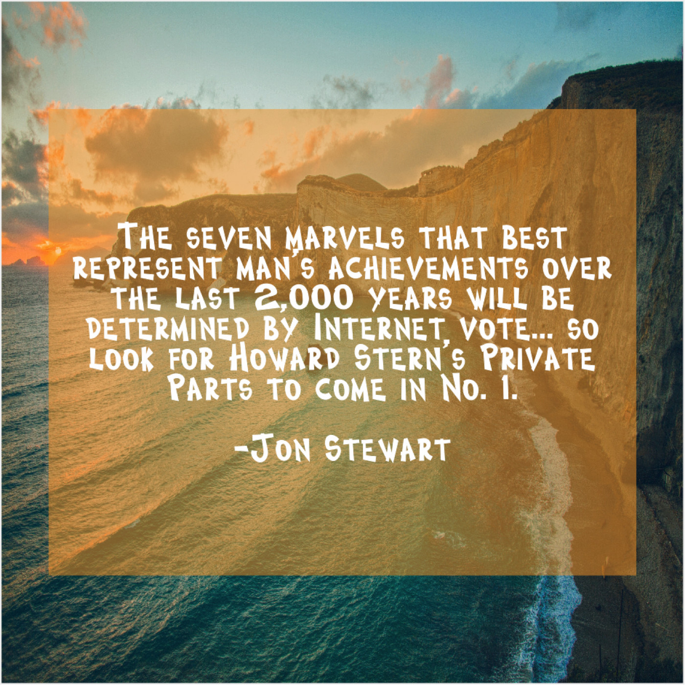 Jon Stewart Jon Stewart – The seven marvels that best… August 23, 2019 admin “The seven marvels that best represent man’s achievements over the last 2,000 years will be determined by Internet vote… so look for Howard Stern’s Private Parts to come in No. 1.”-Jon Stewart
