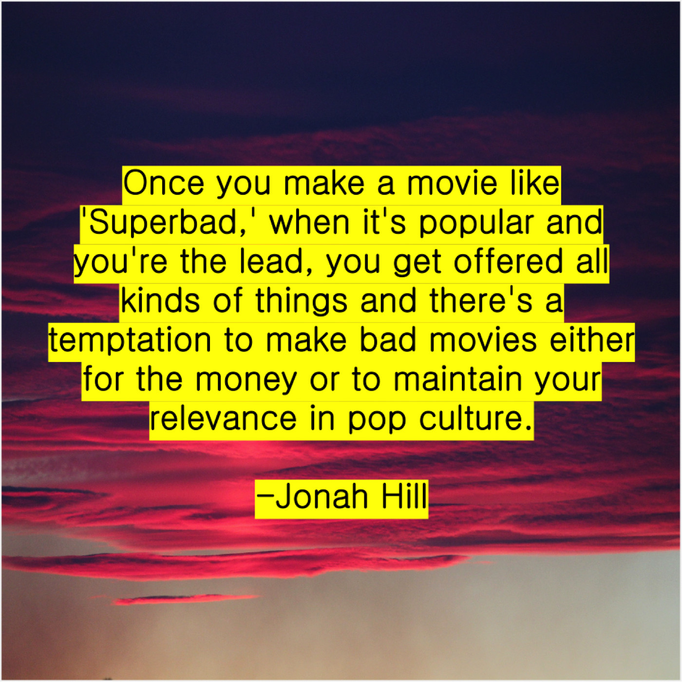 Jonah Hill Jonah Hill – Once you make a movie… July 8, 2019 admin “Once you make a movie like ‘Superbad,’ when it’s popular and you’re the lead, you get offered all kinds of things and there’s a temptation to make bad movies either for the money or to maintain your relevance in pop culture.”-Jonah Hill