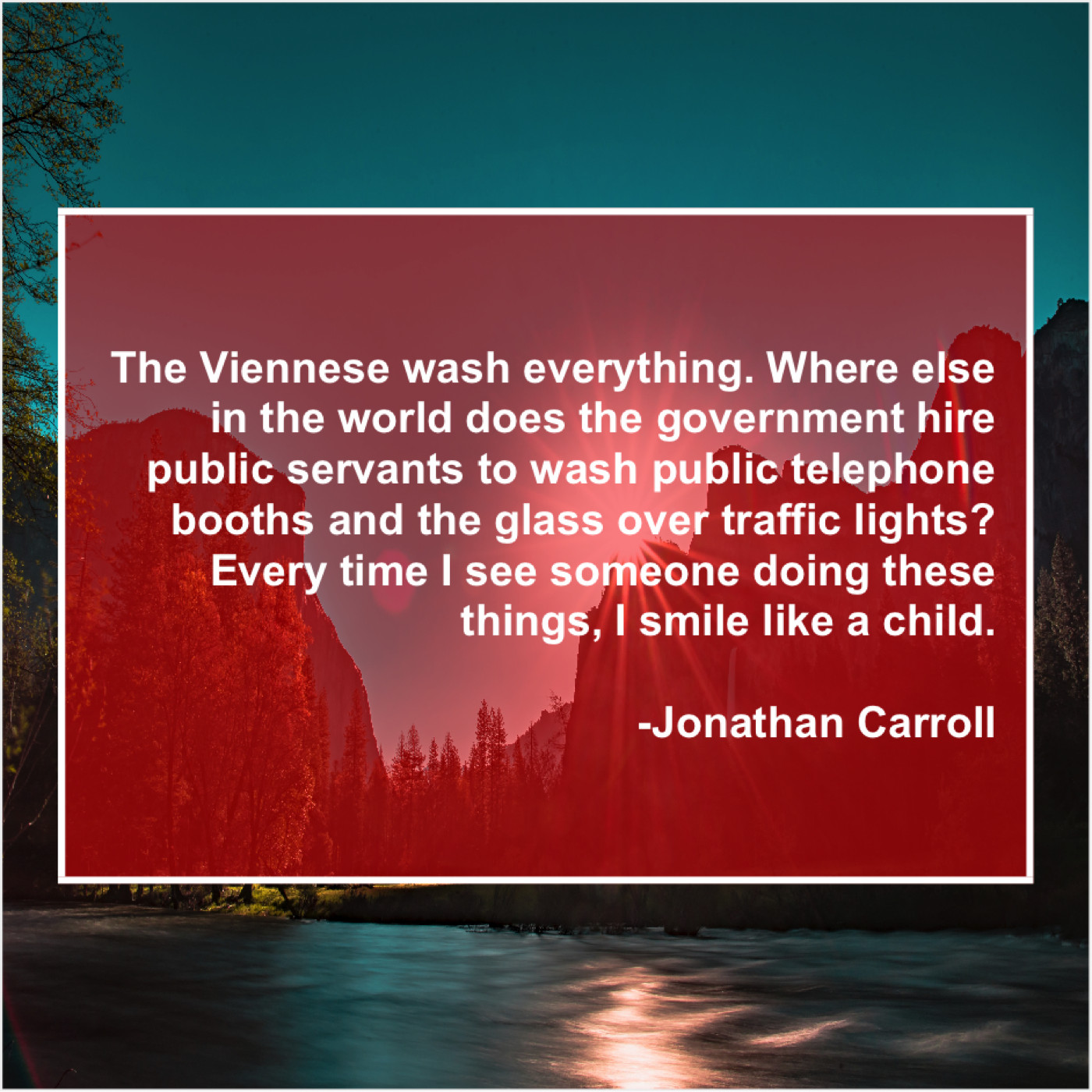 Jonathan Carroll Jonathan Carroll – The Viennese wash everything. Where… June 12, 2019 admin “The Viennese wash everything. Where else in the world does the government hire public servants to wash public telephone booths and the glass over traffic lights? Every time I see someone doing these things, I smile like a child.”-Jonathan Carroll
