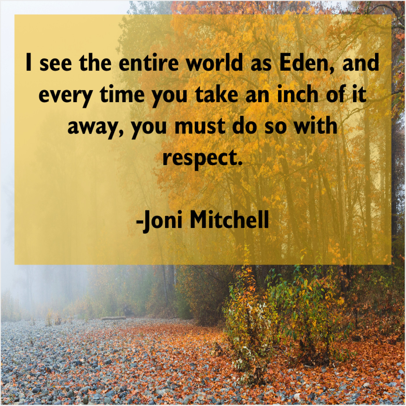 Joni Mitchell Joni Mitchell – I see the entire world… October 29, 2018 admin “I see the entire world as Eden, and every time you take an inch of it away, you must do so with respect.”-Joni Mitchell