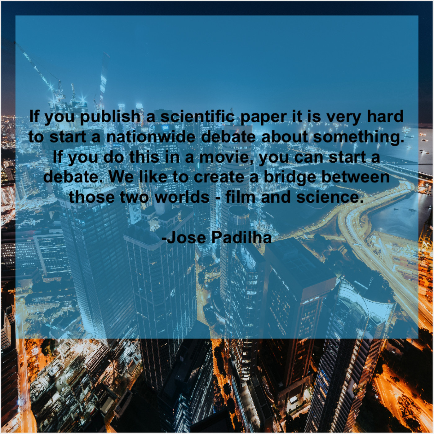 Jose Padilha Jose Padilha – If you publish a scientific… October 20, 2019 admin “If you publish a scientific paper it is very hard to start a nationwide debate about something. If you do this in a movie, you can start a debate. We like to create a bridge between those two worlds – film and science.”-Jose Padilha