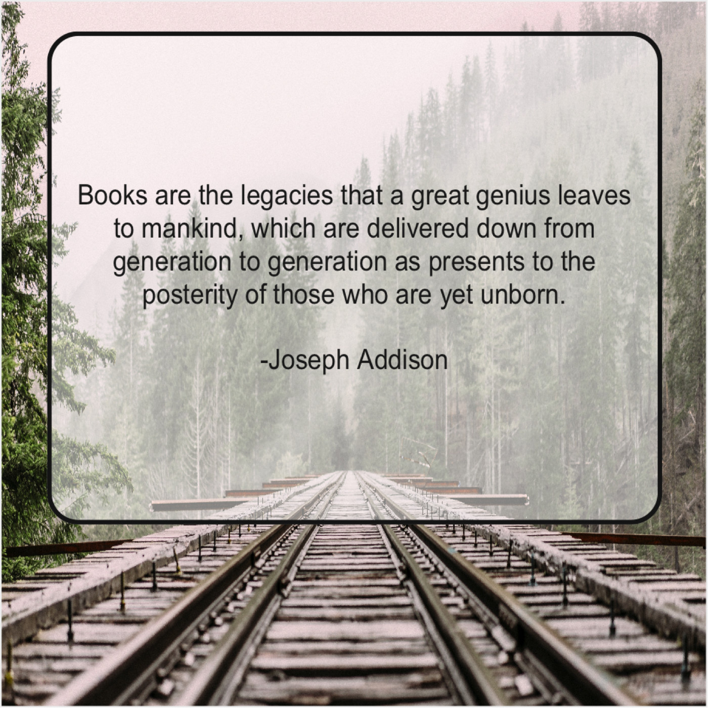Joseph Addison Joseph Addison – Books are the legacies that… February 19, 2019 admin “Books are the legacies that a great genius leaves to mankind, which are delivered down from generation to generation as presents to the posterity of those who are yet unborn.”-Joseph Addison