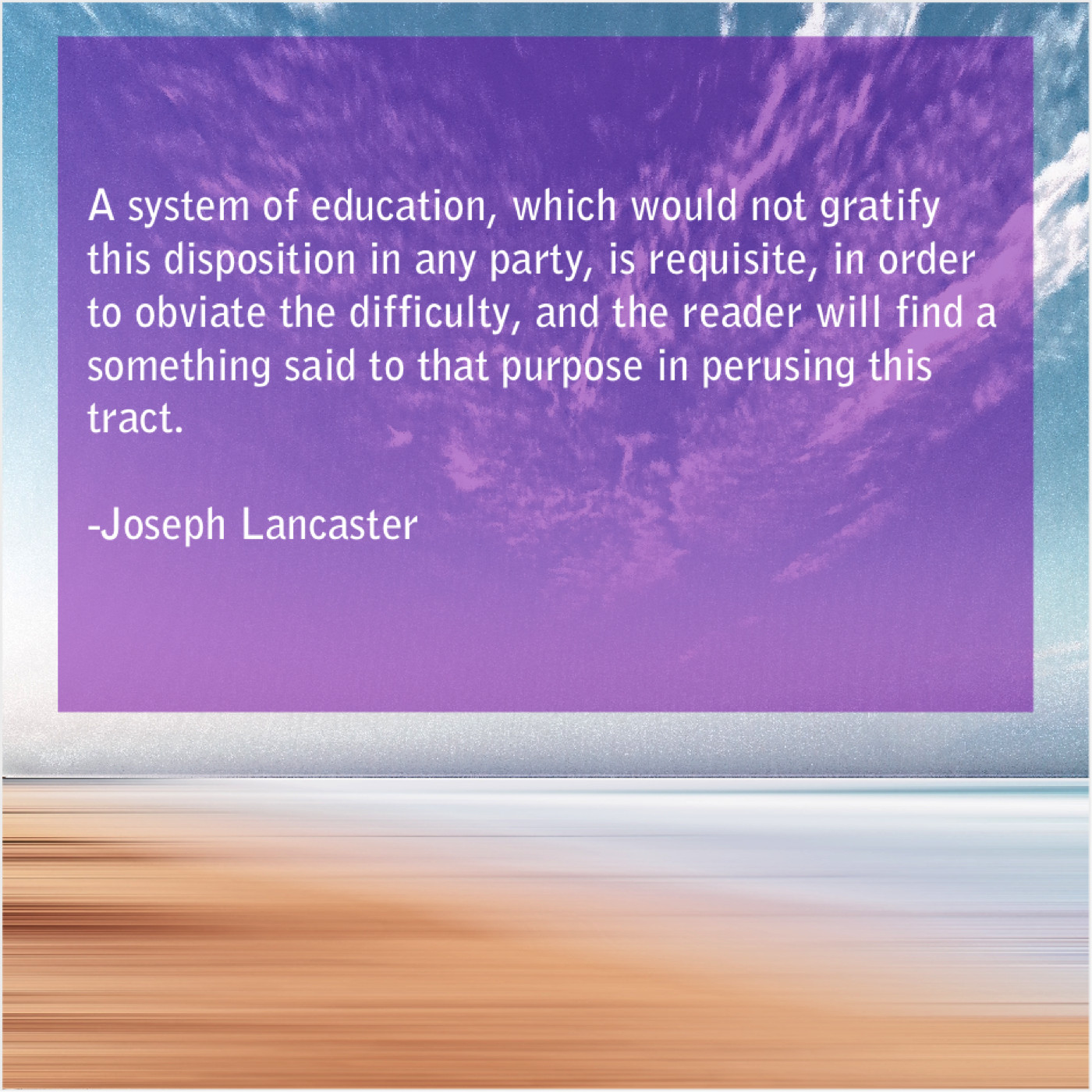 Joseph Lancaster Joseph Lancaster – A system of education, which… December 5, 2018 admin “A system of education, which would not gratify this disposition in any party, is requisite, in order to obviate the difficulty, and the reader will find a something said to that purpose in perusing this tract.”-Joseph Lancaster