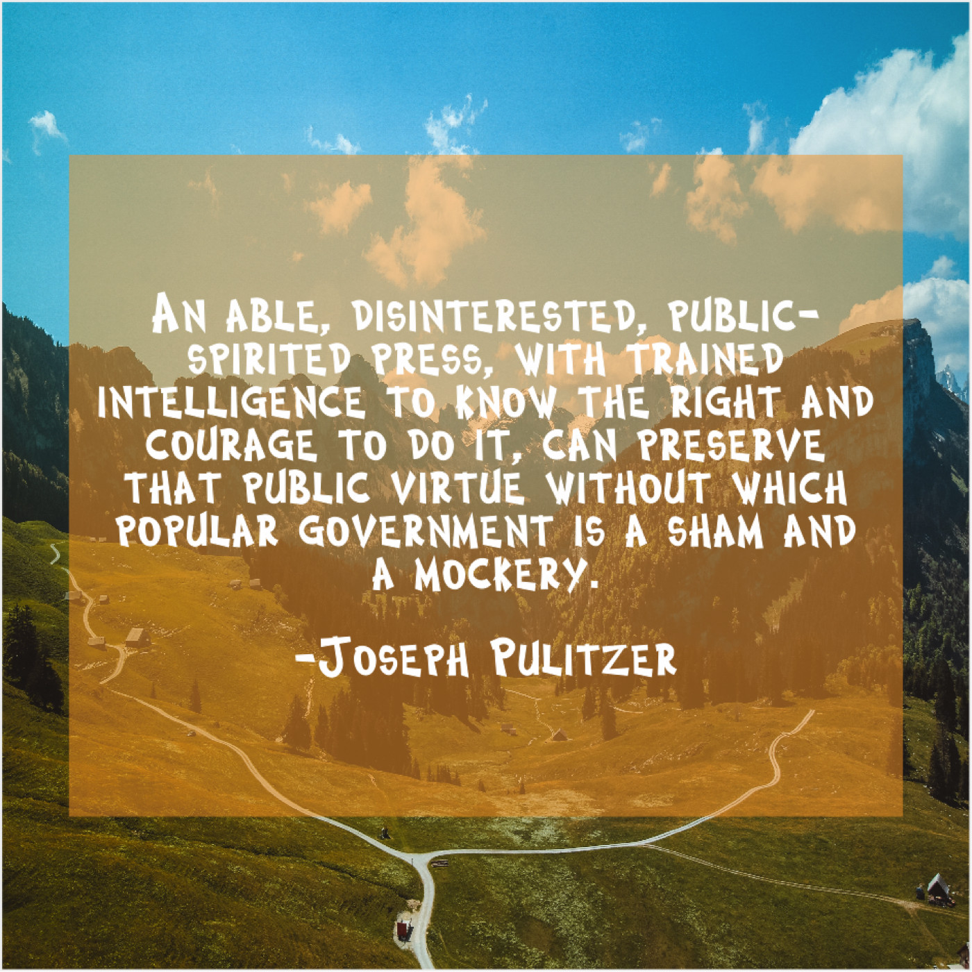 Joseph Pulitzer Joseph Pulitzer – An able, disinterested, public-spirited… September 27, 2019 admin “An able, disinterested, public-spirited press, with trained intelligence to know the right and courage to do it, can preserve that public virtue without which popular government is a sham and a mockery.”-Joseph Pulitzer