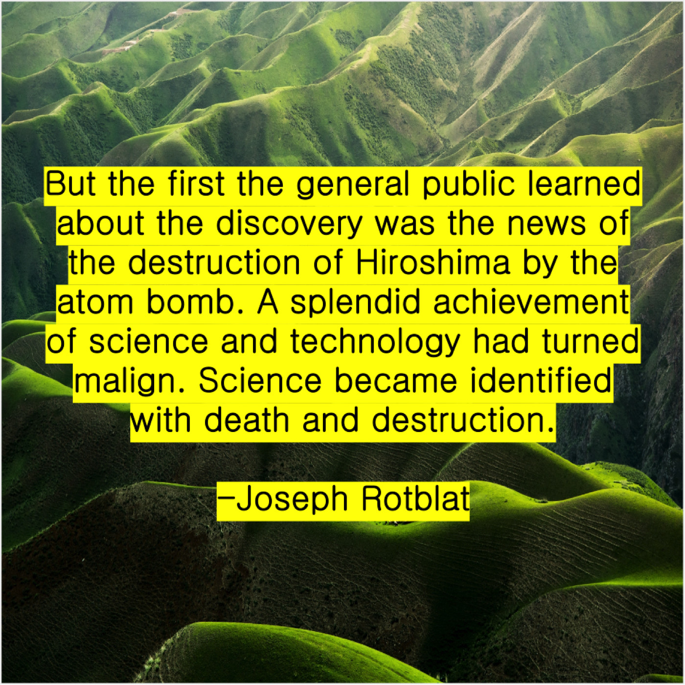 “But the first the general public learned about the discovery was the news of the destruction of Hiroshima by the atom bomb. A splendid achievement of science and technology had turned malign. Science became identified with death and destruction.”