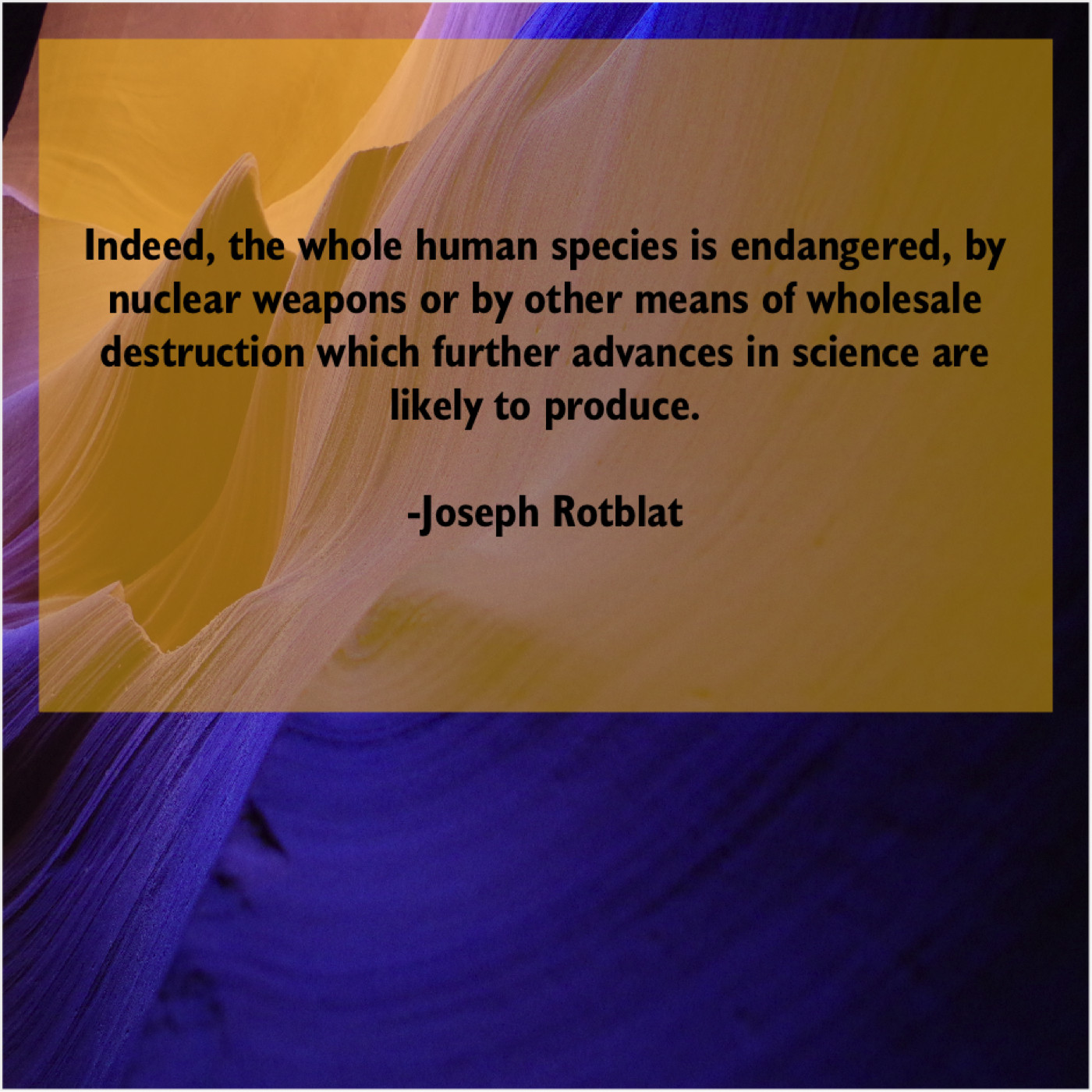 Joseph Rotblat Joseph Rotblat – Indeed, the whole human species… September 3, 2019 admin “Indeed, the whole human species is endangered, by nuclear weapons or by other means of wholesale destruction which further advances in science are likely to produce.”-Joseph Rotblat