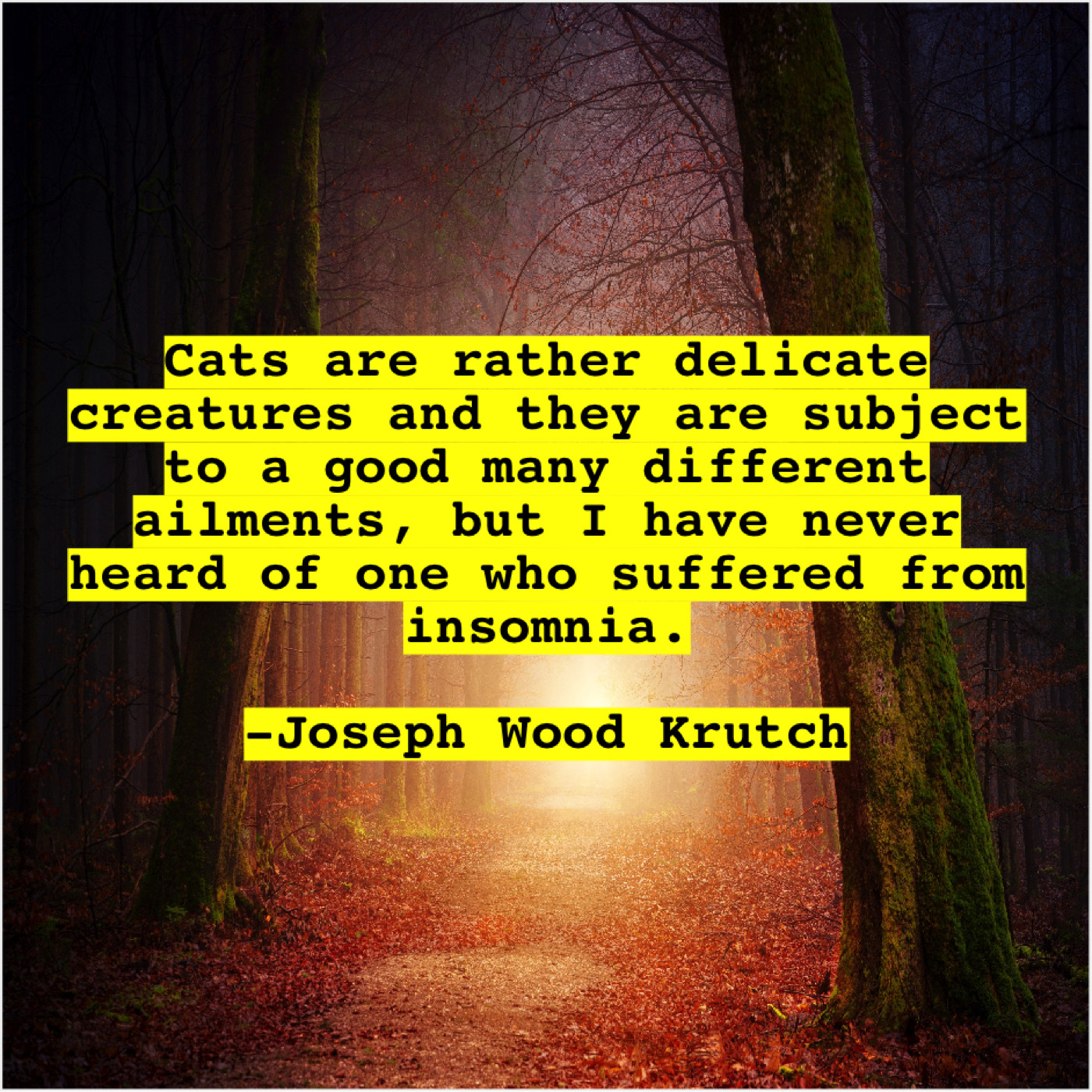 Joseph Wood Krutch Joseph Wood Krutch – Cats are rather delicate creatures… April 13, 2019 admin “Cats are rather delicate creatures and they are subject to a good many different ailments, but I have never heard of one who suffered from insomnia.”-Joseph Wood Krutch