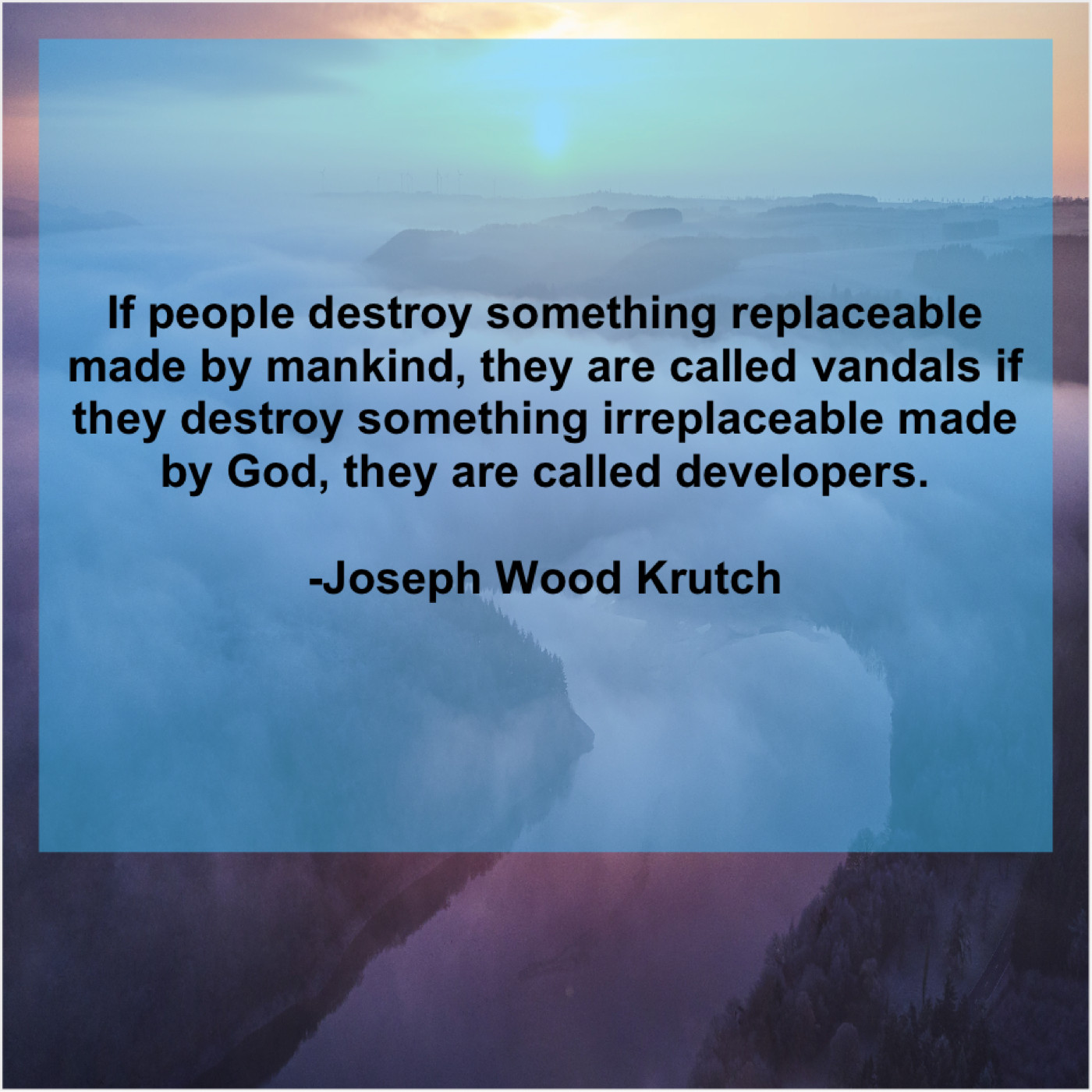 Joseph Wood Krutch Joseph Wood Krutch – If people destroy something replaceable… November 15, 2018 admin “If people destroy something replaceable made by mankind, they are called vandals if they destroy something irreplaceable made by God, they are called developers.”-Joseph Wood Krutch