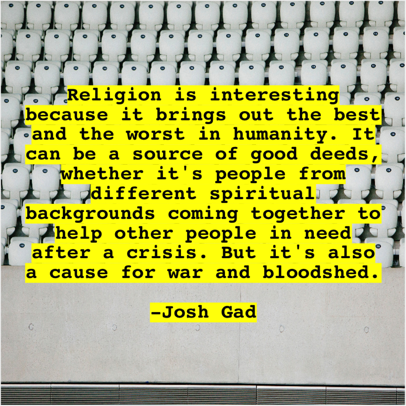 “Religion is interesting because it brings out the best and the worst in humanity. It can be a source of good deeds, whether it’s people from different spiritual backgrounds coming together to help other people in need after a crisis. But it’s also a cause for war and bloodshed.”