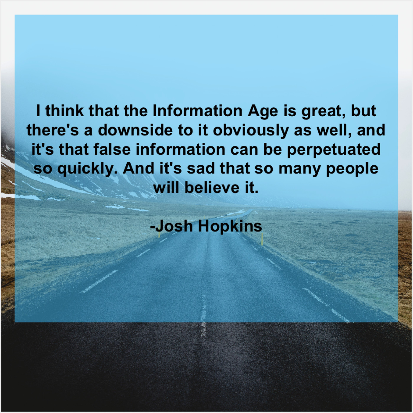 Josh Hopkins Josh Hopkins – I think that the Information… January 25, 2019 admin “I think that the Information Age is great, but there’s a downside to it obviously as well, and it’s that false information can be perpetuated so quickly. And it’s sad that so many people will believe it.”-Josh Hopkins