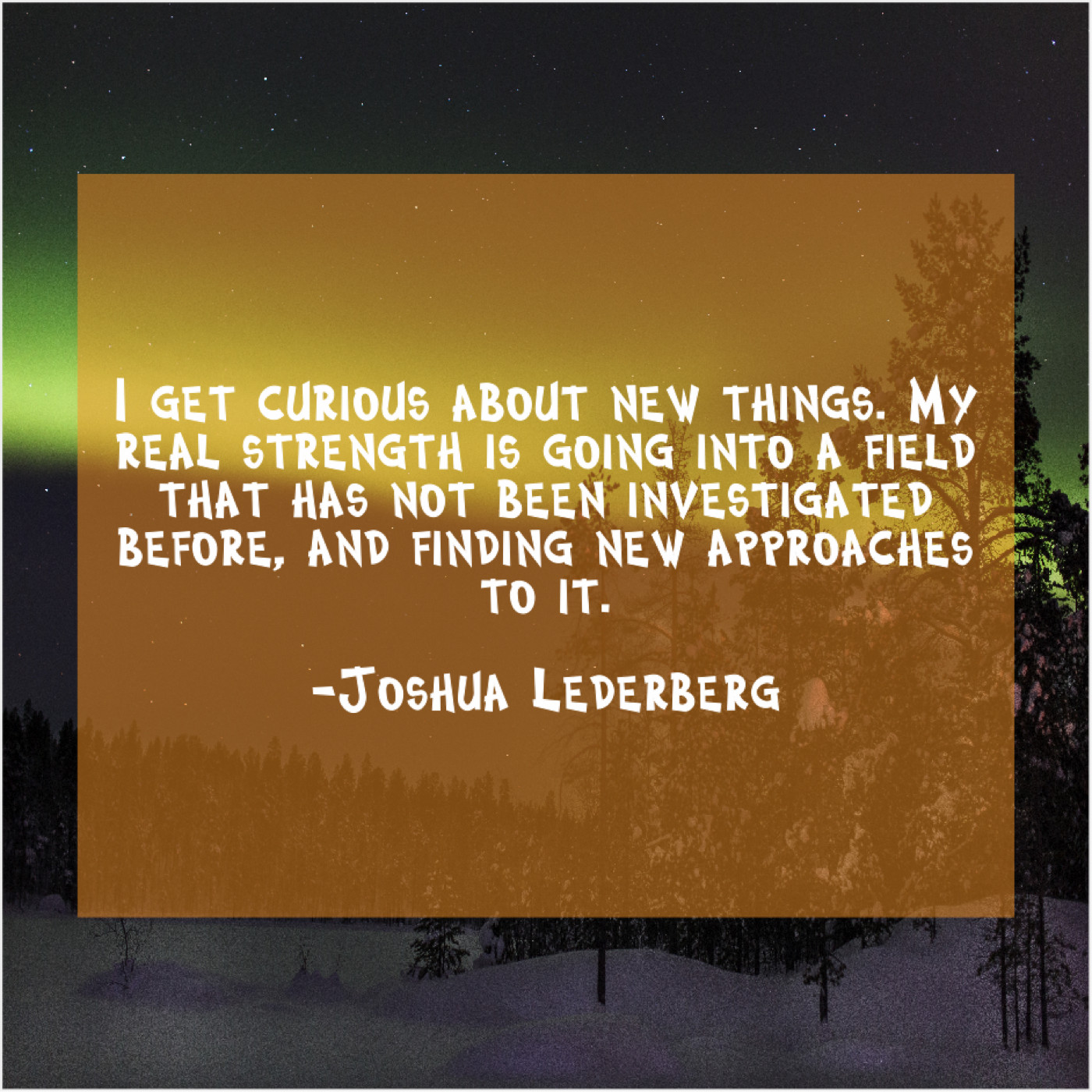Joshua Lederberg Joshua Lederberg – I get curious about new… December 29, 2018 admin “I get curious about new things. My real strength is going into a field that has not been investigated before, and finding new approaches to it.”-Joshua Lederberg