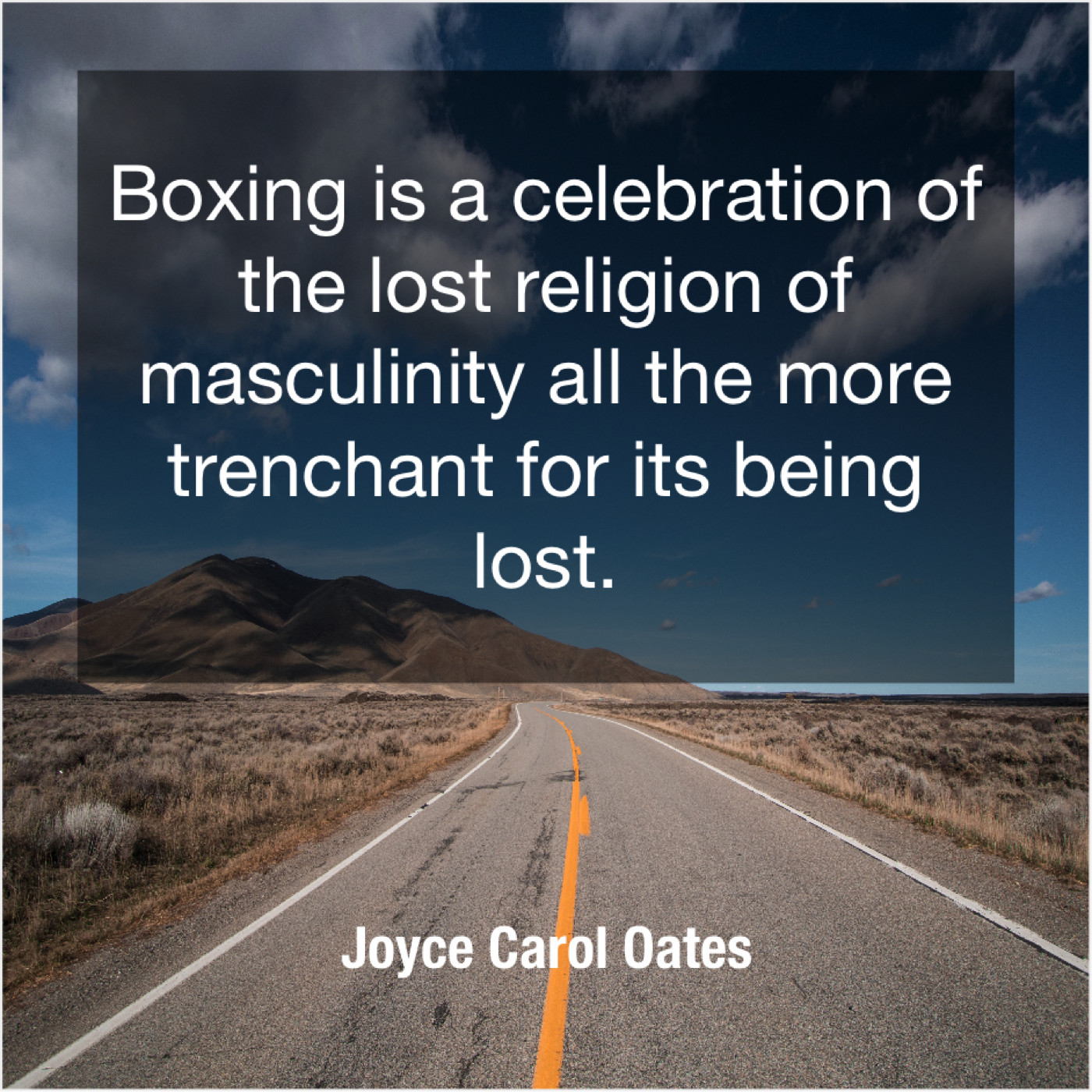 Joyce Carol Oates Joyce Carol Oates – Boxing is a celebration of… January 9, 2019 admin “Boxing is a celebration of the lost religion of masculinity all the more trenchant for its being lost.”-Joyce Carol Oates