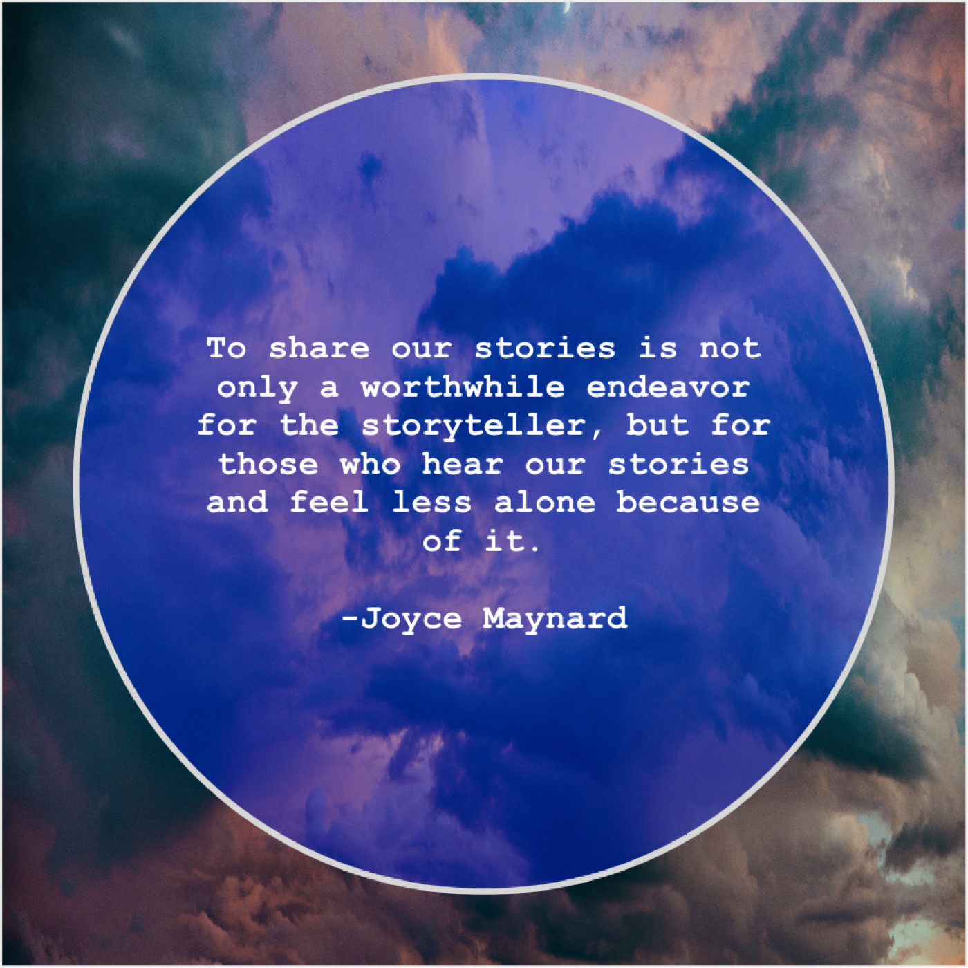 Joyce Maynard Joyce Maynard – To share our stories is… December 1, 2018 admin “To share our stories is not only a worthwhile endeavor for the storyteller, but for those who hear our stories and feel less alone because of it.”-Joyce Maynard