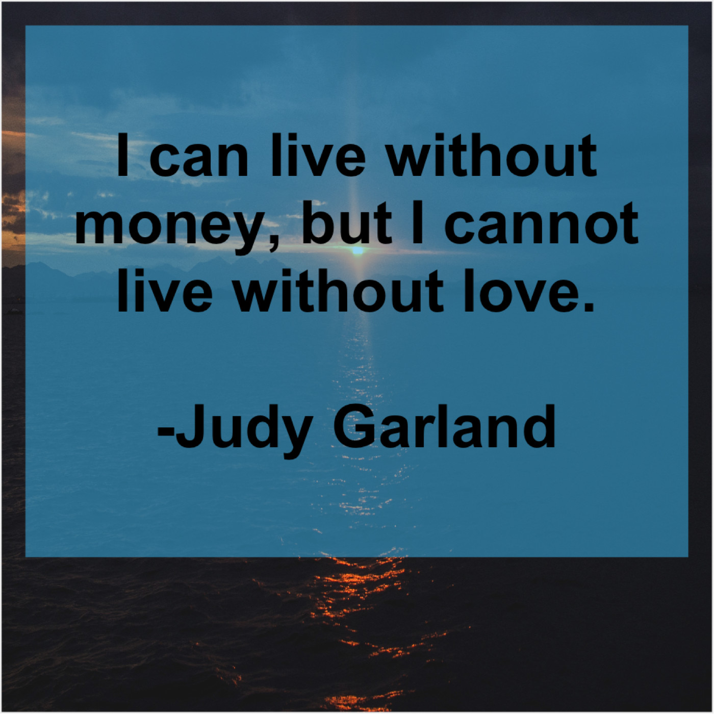 Judy Garland Judy Garland – I can live without money… July 18, 2019 admin “I can live without money, but I cannot live without love.”-Judy Garland
