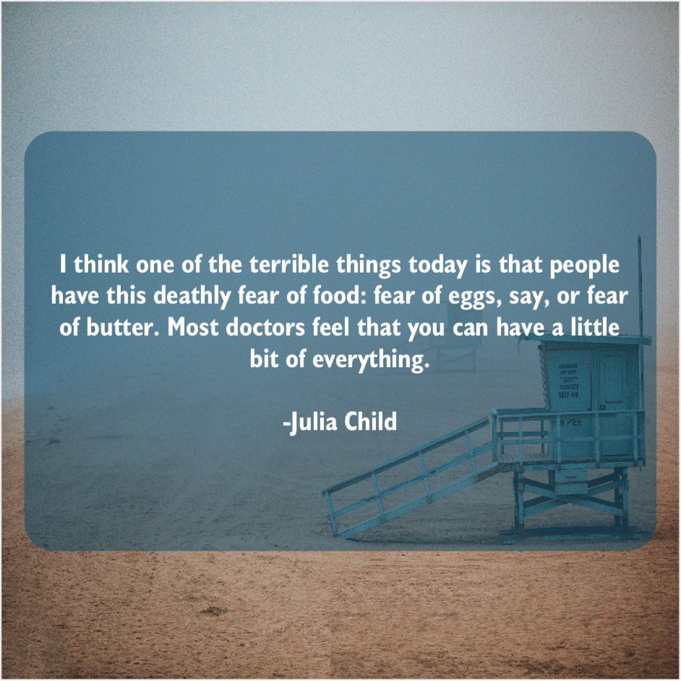 Julia Child Julia Child – I think one of the… September 22, 2019 admin “I think one of the terrible things today is that people have this deathly fear of food: fear of eggs, say, or fear of butter. Most doctors feel that you can have a little bit of everything.”-Julia Child