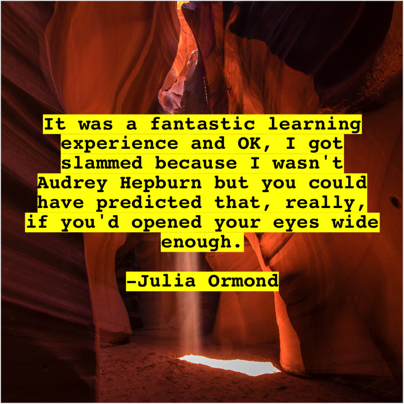 Julia Ormond Julia Ormond – It was a fantastic learning… December 4, 2018 admin “It was a fantastic learning experience and OK, I got slammed because I wasn’t Audrey Hepburn but you could have predicted that, really, if you’d opened your eyes wide enough.”-Julia Ormond
