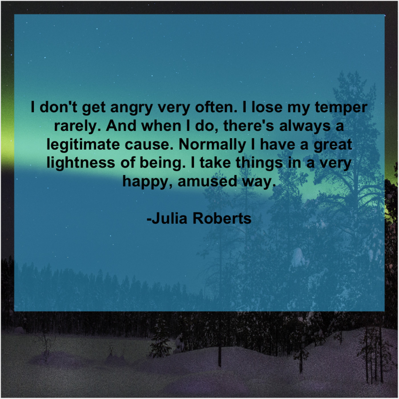 Julia Roberts Julia Roberts – I don’t get angry very… November 13, 2018 admin “I don’t get angry very often. I lose my temper rarely. And when I do, there’s always a legitimate cause. Normally I have a great lightness of being. I take things in a very happy, amused way.”-Julia Roberts