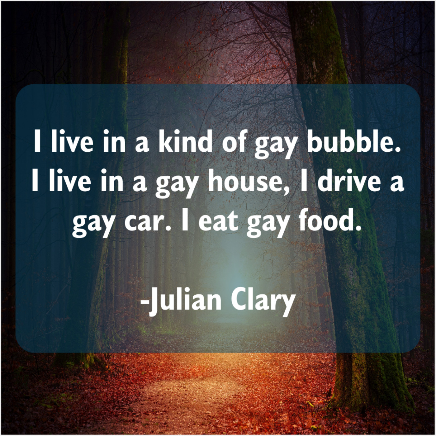 Julian Clary Julian Clary – I live in a kind… October 10, 2019 admin “I live in a kind of gay bubble. I live in a gay house, I drive a gay car. I eat gay food.”-Julian Clary