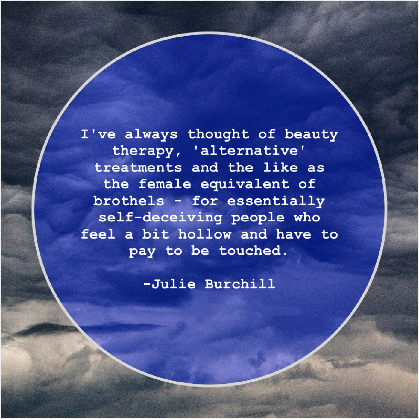 Julie Burchill Julie Burchill – I’ve always thought of beauty… November 25, 2018 admin “I’ve always thought of beauty therapy, ‘alternative’ treatments and the like as the female equivalent of brothels – for essentially self-deceiving people who feel a bit hollow and have to pay to be touched.”-Julie Burchill