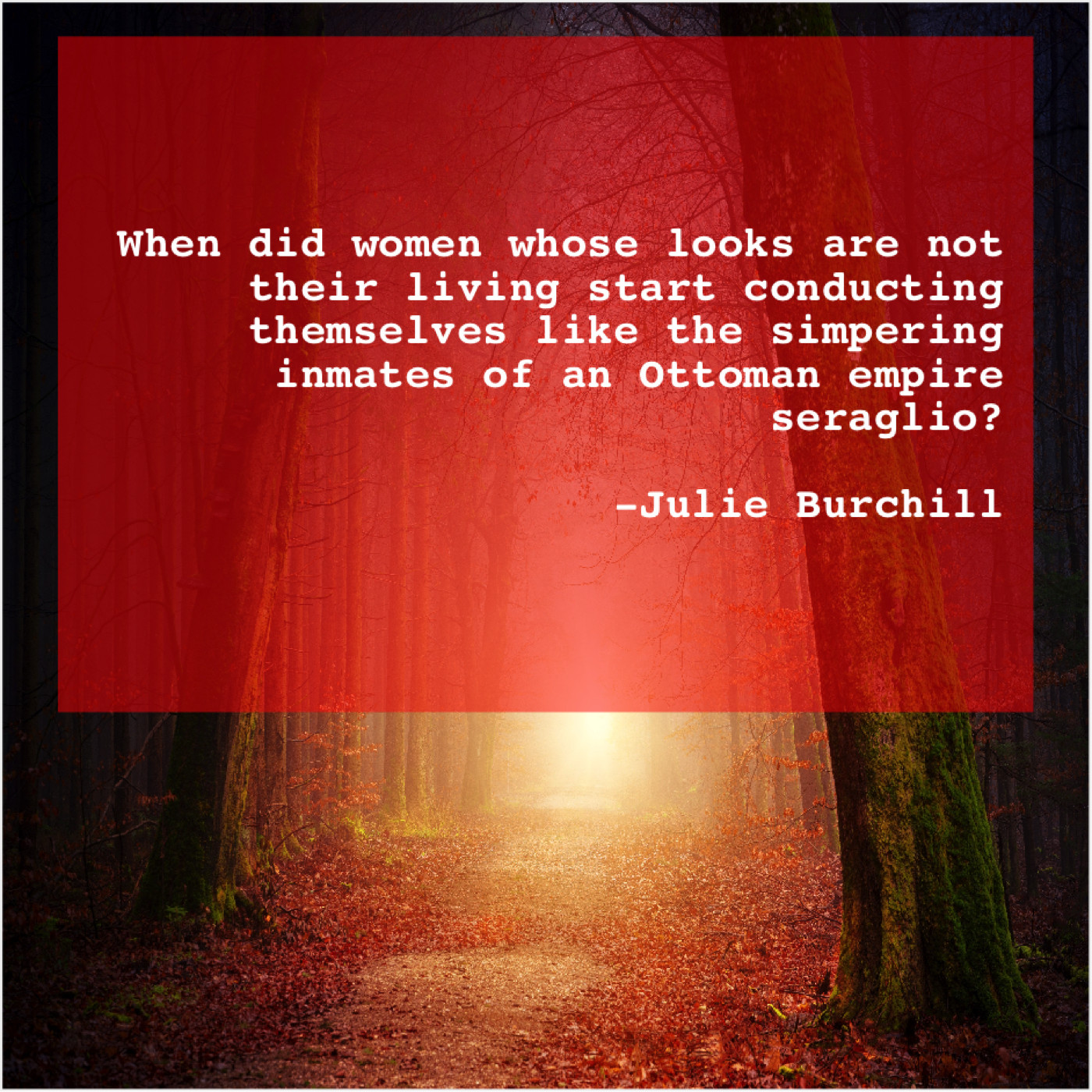 Julie Burchill Julie Burchill – When did women whose looks… June 29, 2019 admin “When did women whose looks are not their living start conducting themselves like the simpering inmates of an Ottoman empire seraglio?”-Julie Burchill