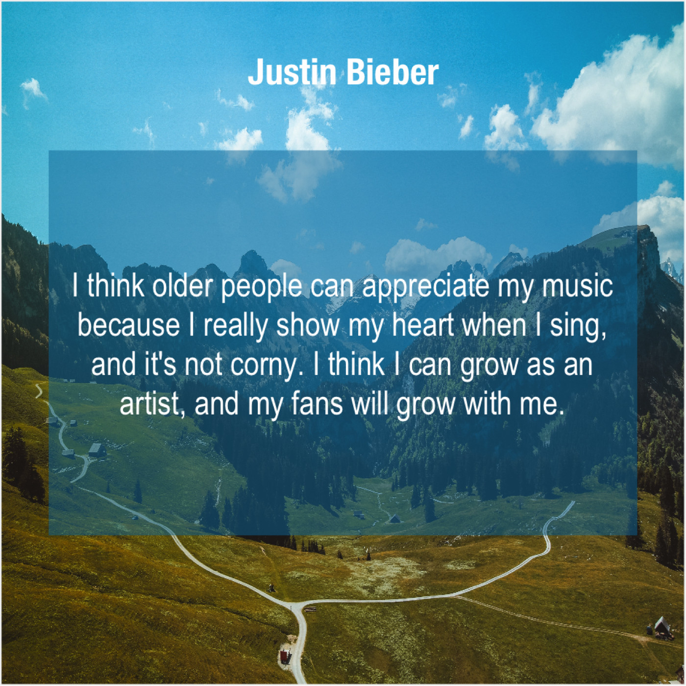 Justin Bieber Justin Bieber – I think older people can… October 13, 2019 admin “I think older people can appreciate my music because I really show my heart when I sing, and it’s not corny. I think I can grow as an artist, and my fans will grow with me.”-Justin Bieber