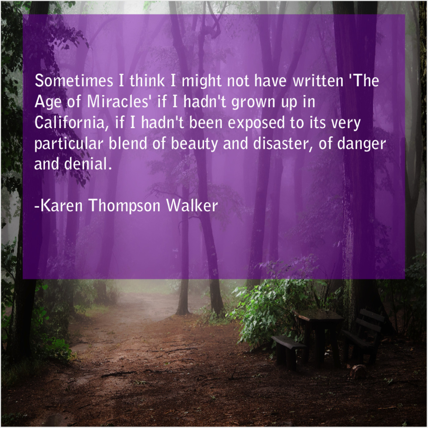 Karen Thompson Walker Karen Thompson Walker – Sometimes I think I might… April 28, 2019 admin “Sometimes I think I might not have written ‘The Age of Miracles’ if I hadn’t grown up in California, if I hadn’t been exposed to its very particular blend of beauty and disaster, of danger and denial.”-Karen Thompson Walker