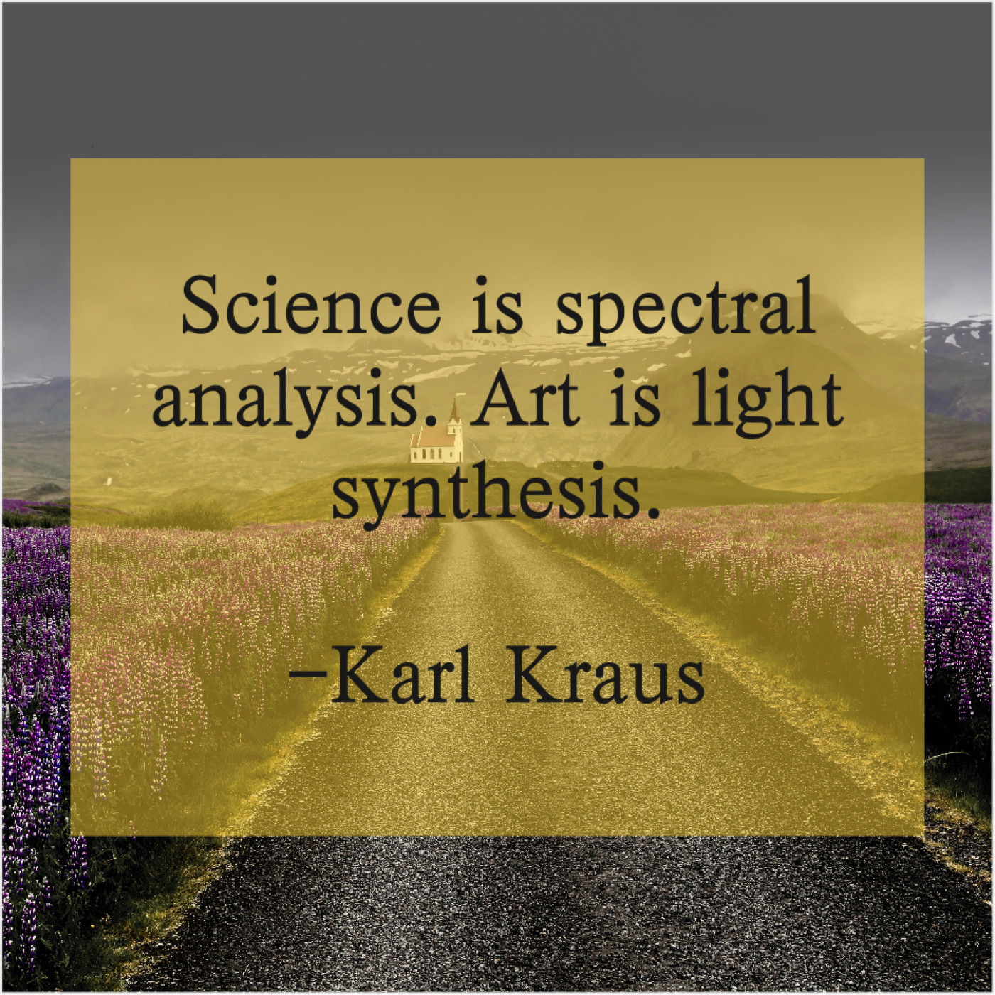 Karl Kraus Karl Kraus – Science is spectral analysis. Art… October 31, 2018 admin “Science is spectral analysis. Art is light synthesis.”-Karl Kraus
