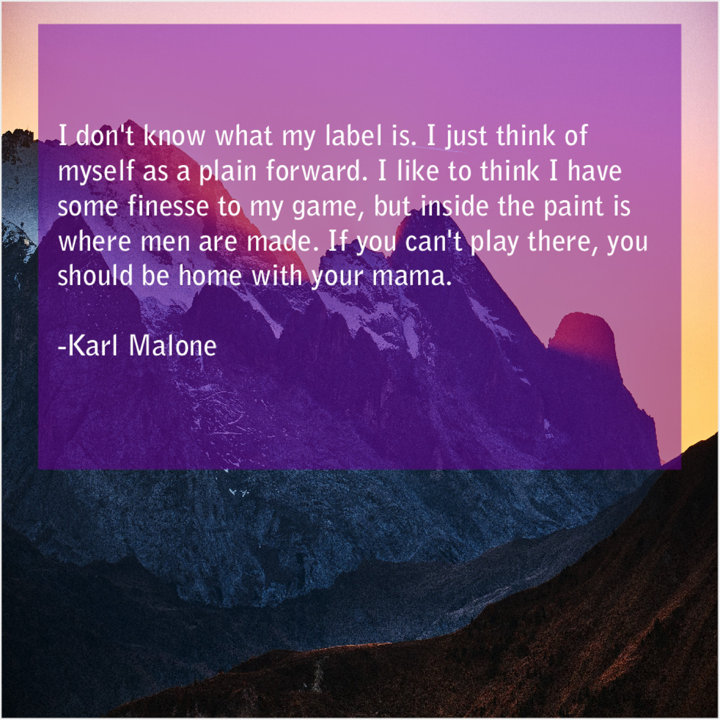 Karl Malone Karl Malone – I don’t know what my… May 11, 2019 admin “I don’t know what my label is. I just think of myself as a plain forward. I like to think I have some finesse to my game, but inside the paint is where men are made. If you can’t play there, you should be home with your mama.”-Karl Malone