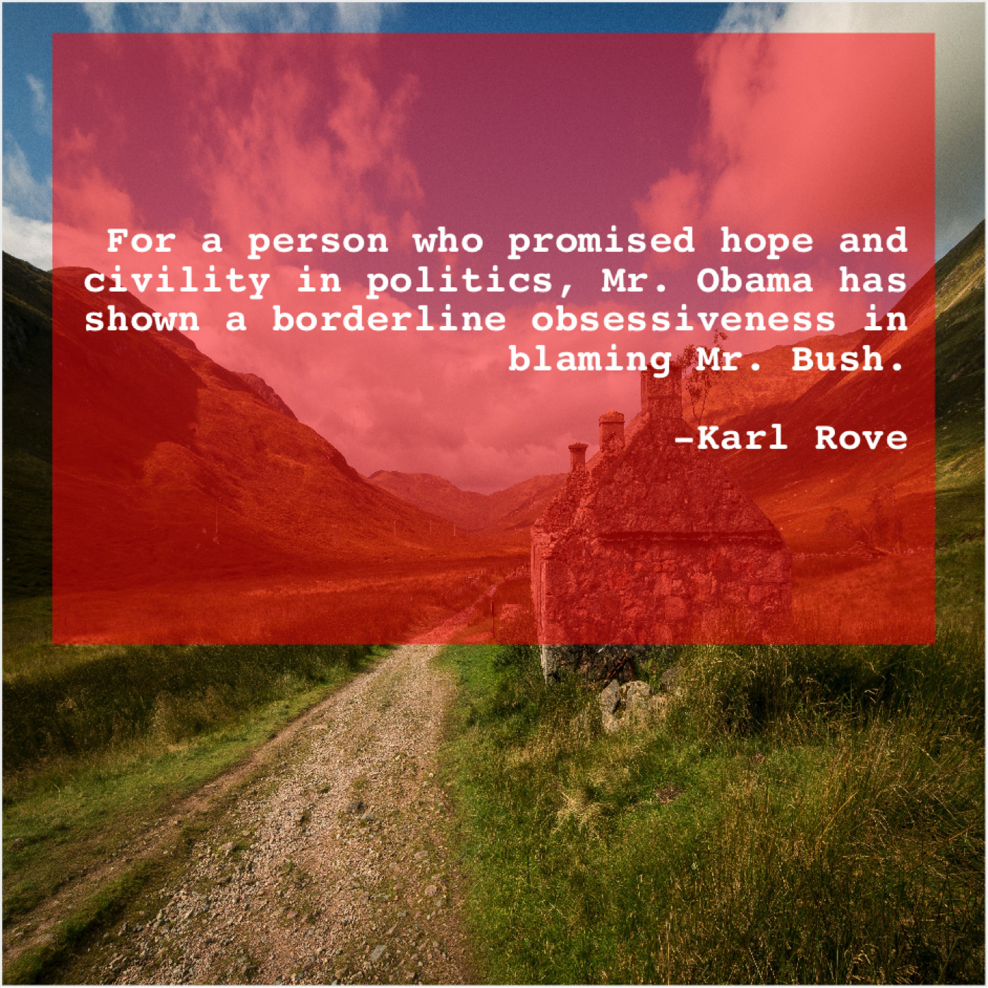 Karl Rove Karl Rove – For a person who promised… February 28, 2019 admin “For a person who promised hope and civility in politics, Mr. Obama has shown a borderline obsessiveness in blaming Mr. Bush.”-Karl Rove
