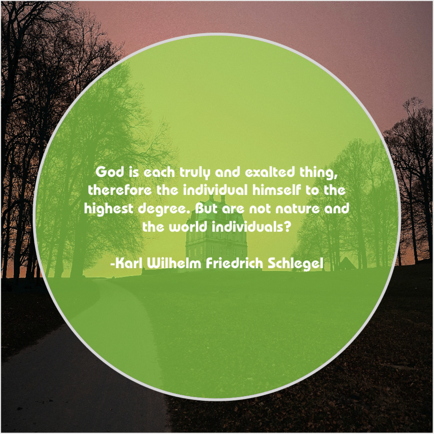 Karl Wilhelm Friedrich Schlegel Karl Wilhelm Friedrich Schlegel – God is each truly and… March 1, 2019 admin “God is each truly and exalted thing, therefore the individual himself to the highest degree. But are not nature and the world individuals?”-Karl Wilhelm Friedrich Schlegel