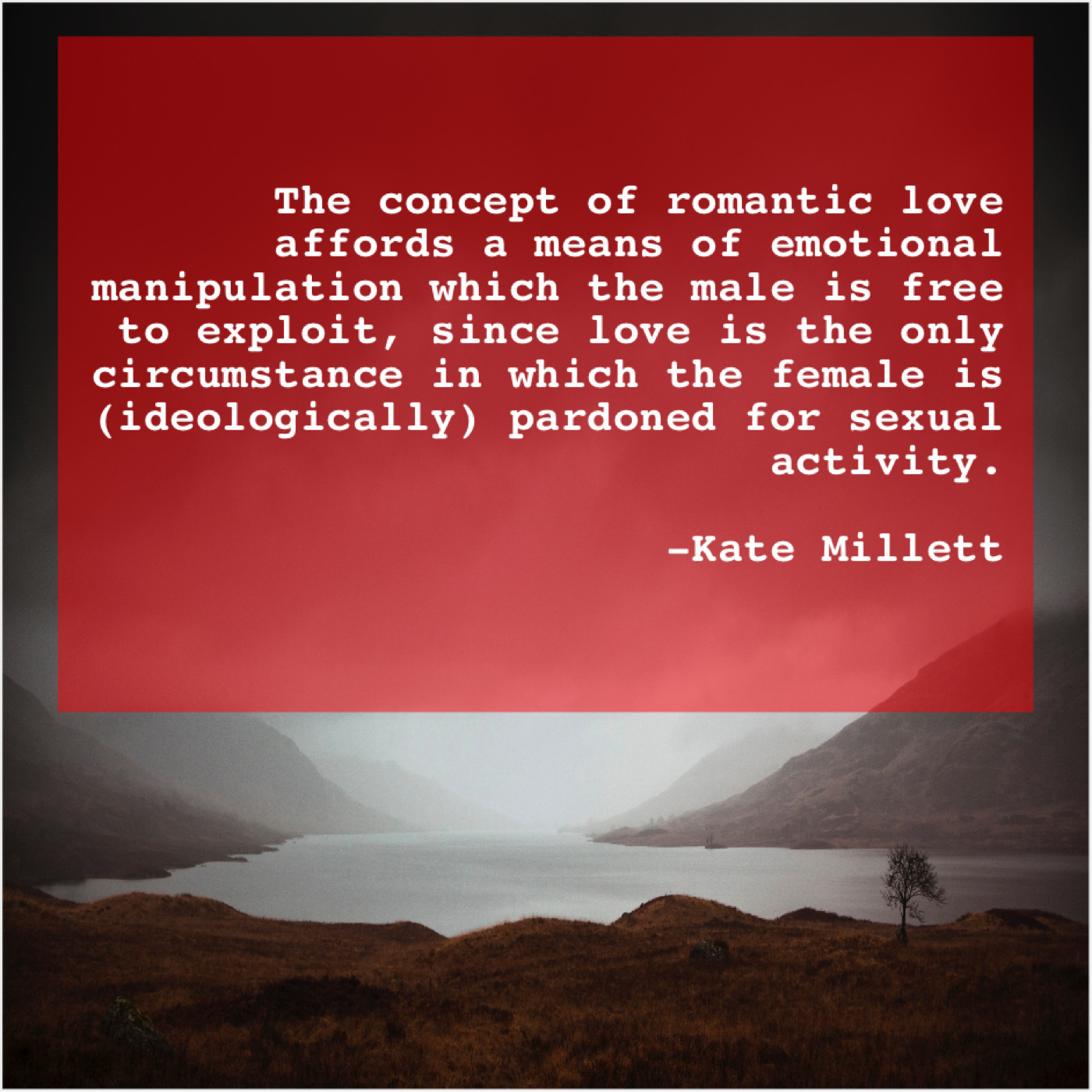 Kate Millett Kate Millett – The concept of romantic love… June 20, 2019 admin “The concept of romantic love affords a means of emotional manipulation which the male is free to exploit, since love is the only circumstance in which the female is (ideologically) pardoned for sexual activity.”-Kate Millett