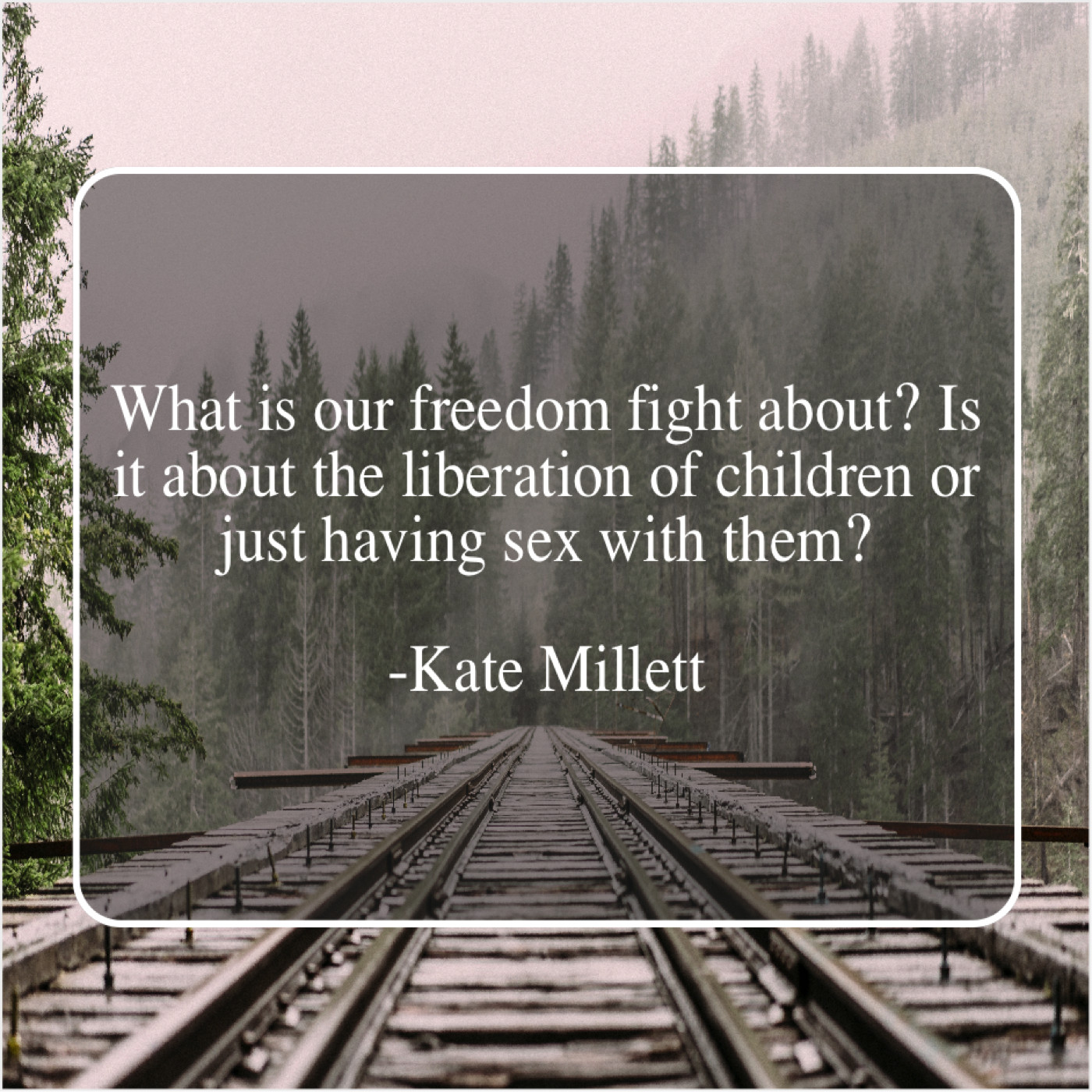 Kate Millett Kate Millett – What is our freedom fight… June 22, 2019 admin “What is our freedom fight about? Is it about the liberation of children or just having sex with them?”-Kate Millett