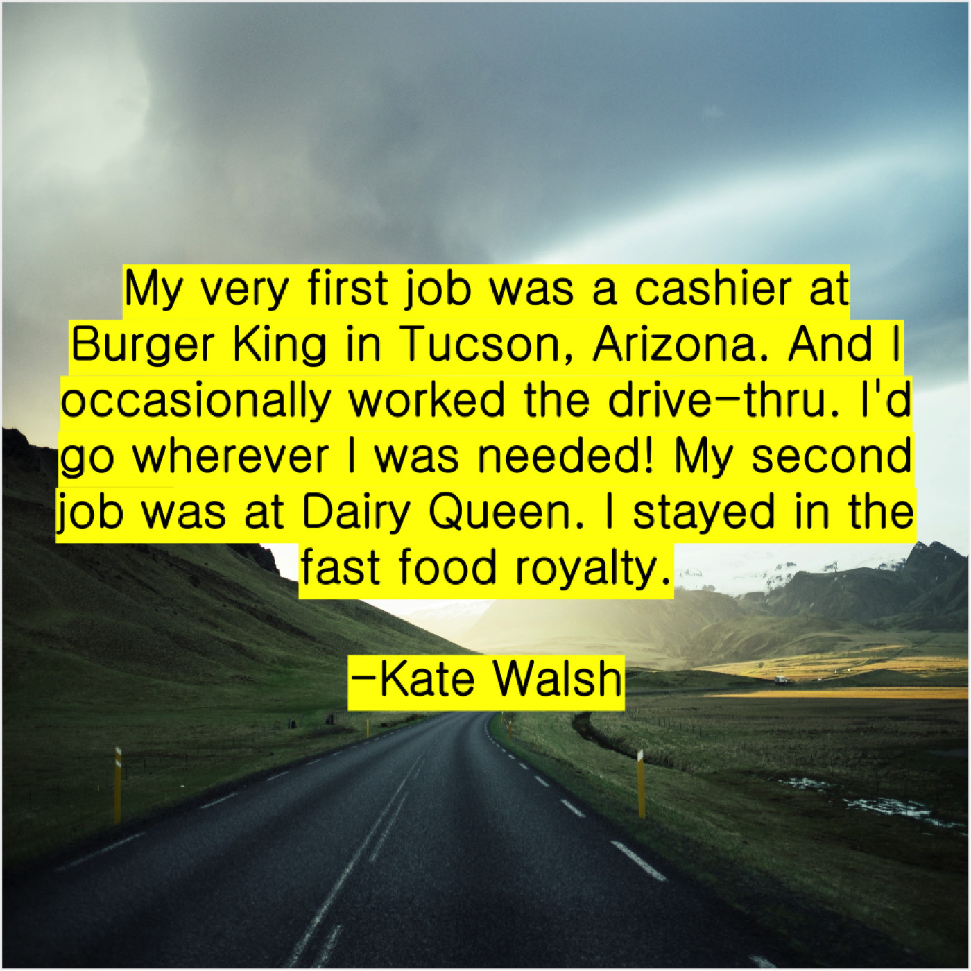 Kate Walsh Kate Walsh – My very first job was… May 14, 2019 admin “My very first job was a cashier at Burger King in Tucson, Arizona. And I occasionally worked the drive-thru. I’d go wherever I was needed! My second job was at Dairy Queen. I stayed in the fast food royalty.”-Kate Walsh