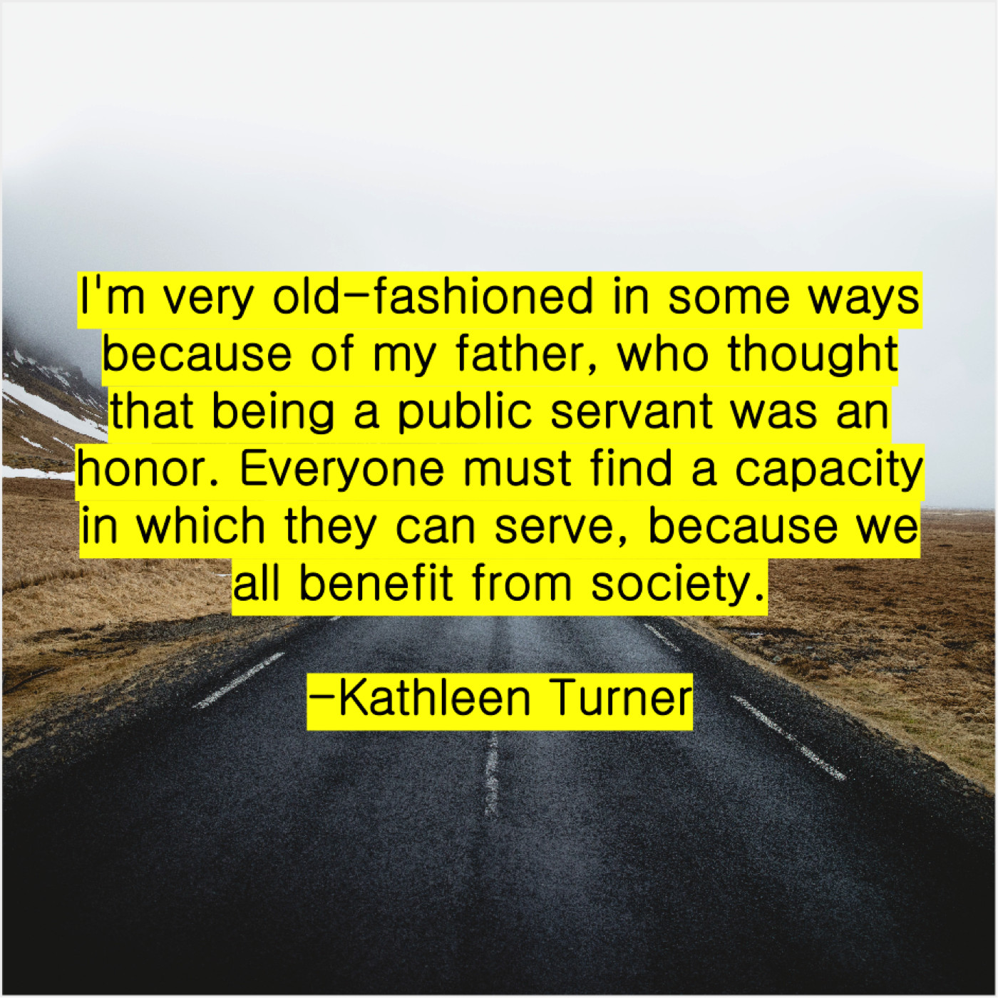 Kathleen Turner Kathleen Turner – I’m very old-fashioned in… May 28, 2019 admin “I’m very old-fashioned in some ways because of my father, who thought that being a public servant was an honor. Everyone must find a capacity in which they can serve, because we all benefit from society.”-Kathleen Turner