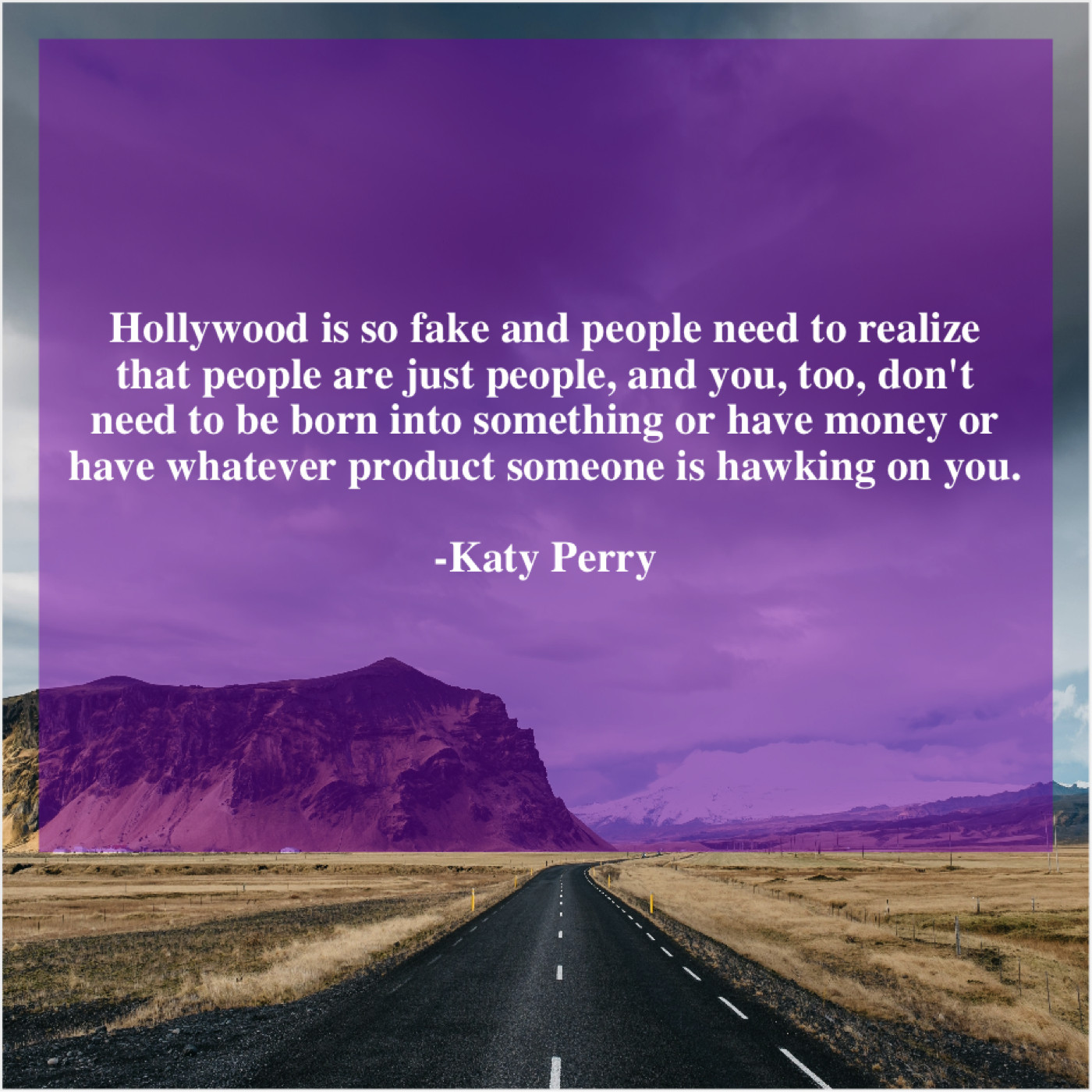 Katy Perry Katy Perry – Hollywood is so fake and… May 15, 2019 admin “Hollywood is so fake and people need to realize that people are just people, and you, too, don’t need to be born into something or have money or have whatever product someone is hawking on you.”-Katy Perry