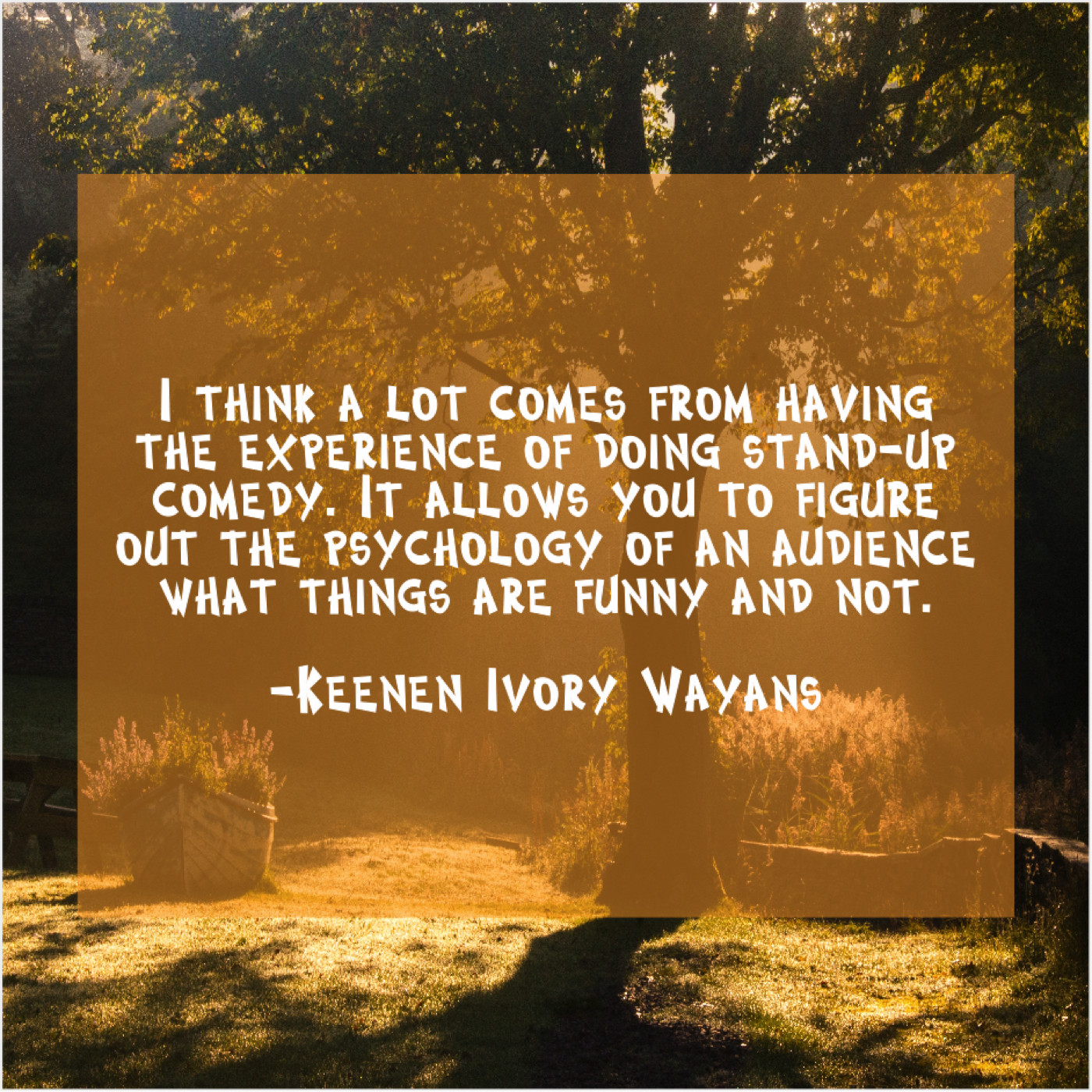 Keenen Ivory Wayans Keenen Ivory Wayans – I think a lot comes… September 3, 2019 admin “I think a lot comes from having the experience of doing stand-up comedy. It allows you to figure out the psychology of an audience what things are funny and not.”-Keenen Ivory Wayans