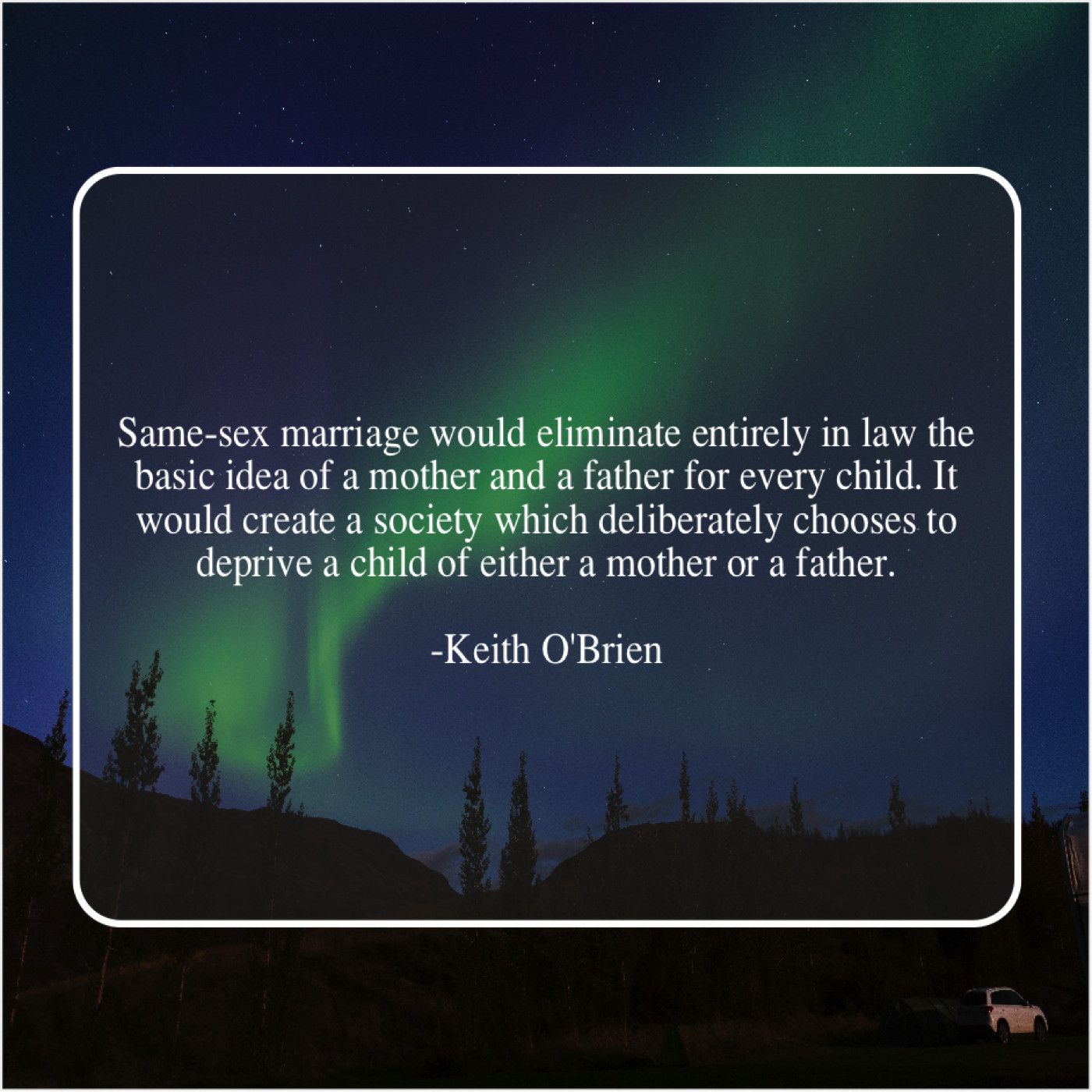 Keith O'Brien Keith O’Brien – Same-sex marriage would eliminate… March 24, 2019 admin “Same-sex marriage would eliminate entirely in law the basic idea of a mother and a father for every child. It would create a society which deliberately chooses to deprive a child of either a mother or a father.”-Keith O’Brien