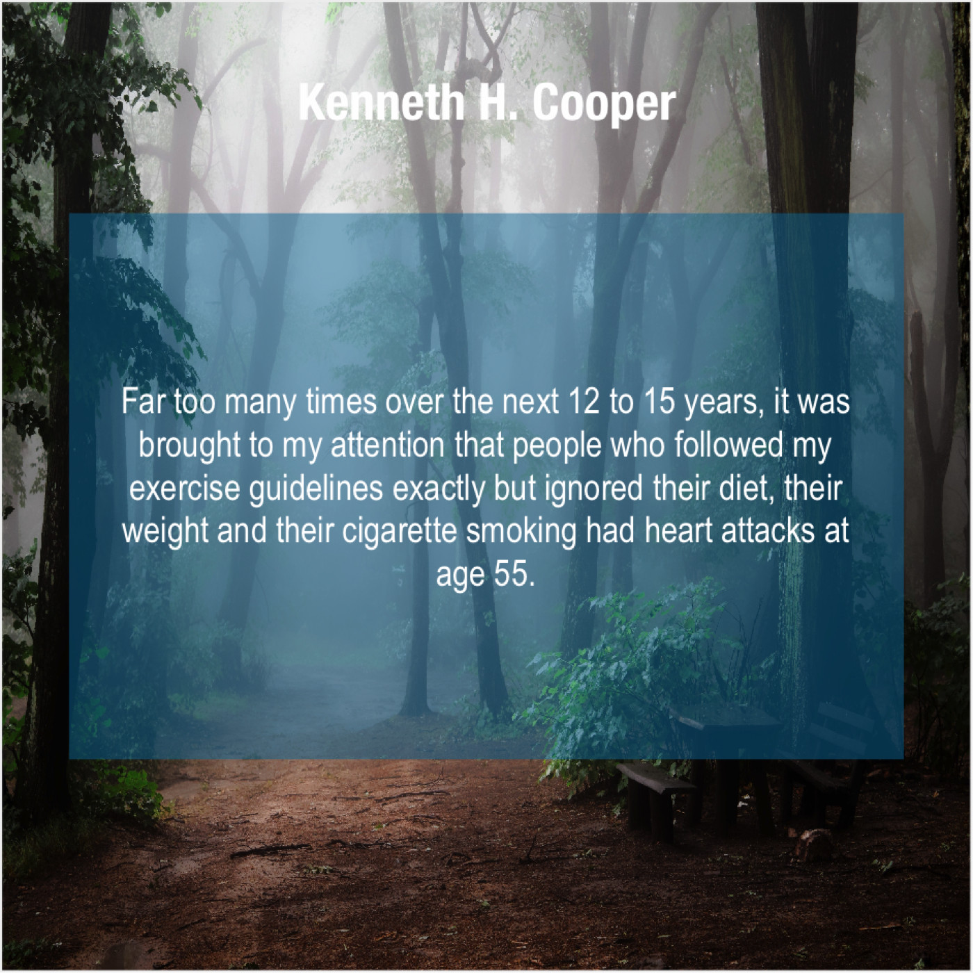 “Far too many times over the next 12 to 15 years, it was brought to my attention that people who followed my exercise guidelines exactly but ignored their diet, their weight and their cigarette smoking had heart attacks at age 55.” -Kenneth H. Cooper