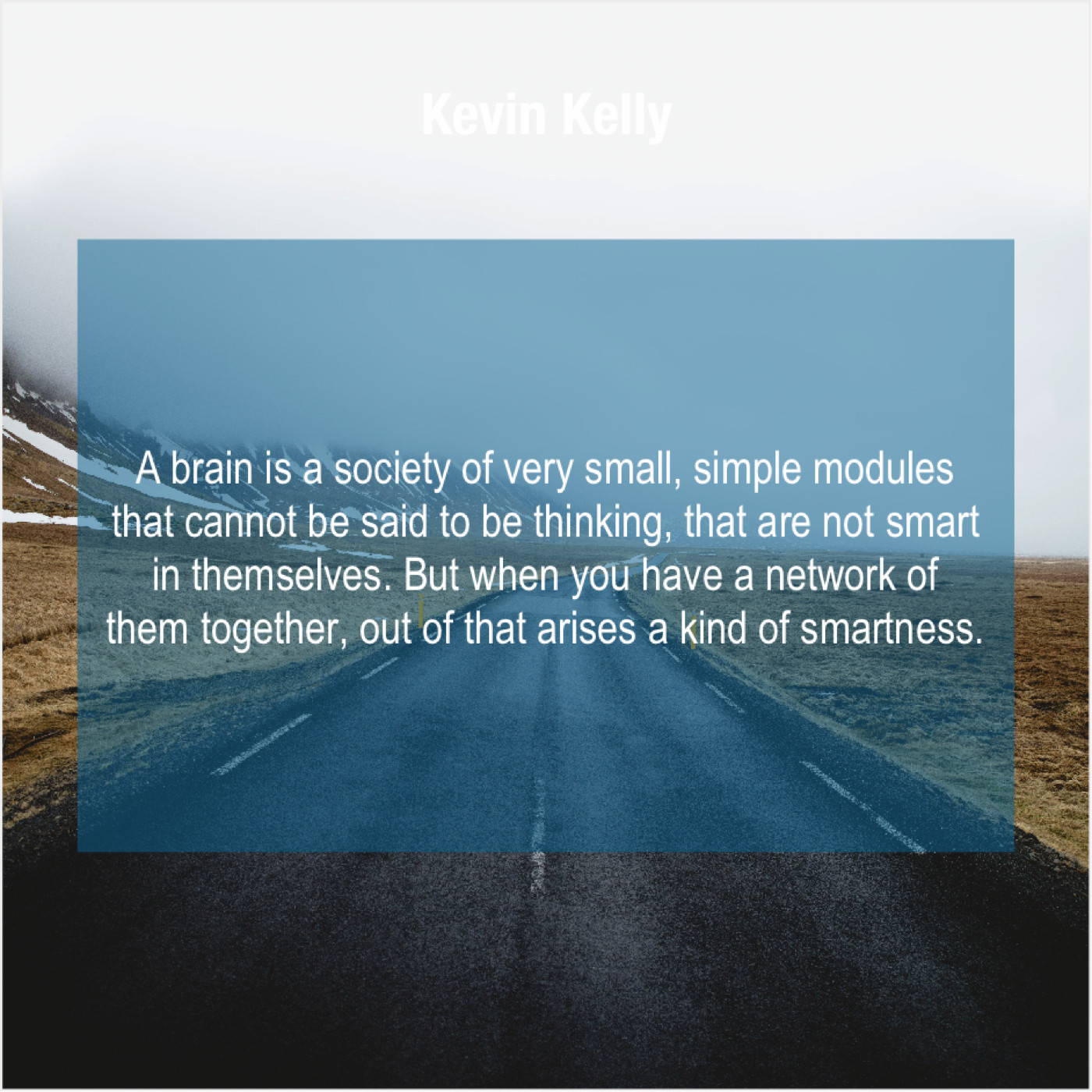 Kevin Kelly Kevin Kelly – A brain is a society… May 15, 2019 admin “A brain is a society of very small, simple modules that cannot be said to be thinking, that are not smart in themselves. But when you have a network of them together, out of that arises a kind of smartness.”-Kevin Kelly