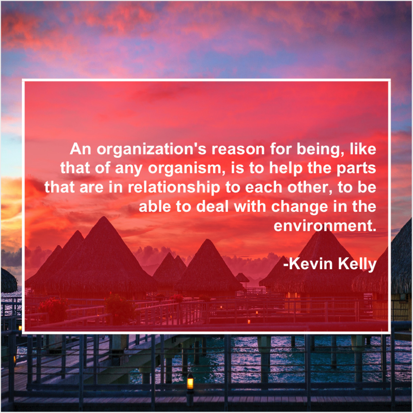 Kevin Kelly Kevin Kelly – An organization’s reason for being… December 22, 2018 admin “An organization’s reason for being, like that of any organism, is to help the parts that are in relationship to each other, to be able to deal with change in the environment.”-Kevin Kelly
