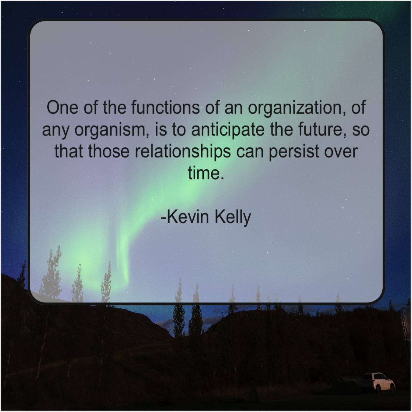 Kevin Kelly Kevin Kelly – One of the functions of… November 21, 2018 admin “One of the functions of an organization, of any organism, is to anticipate the future, so that those relationships can persist over time.”-Kevin Kelly