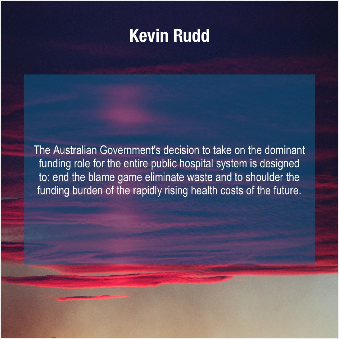 “The Australian Government’s decision to take on the dominant funding role for the entire public hospital system is designed to: end the blame game eliminate waste and to shoulder the funding burden of the rapidly rising health costs of the future.”